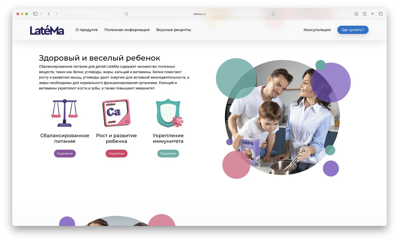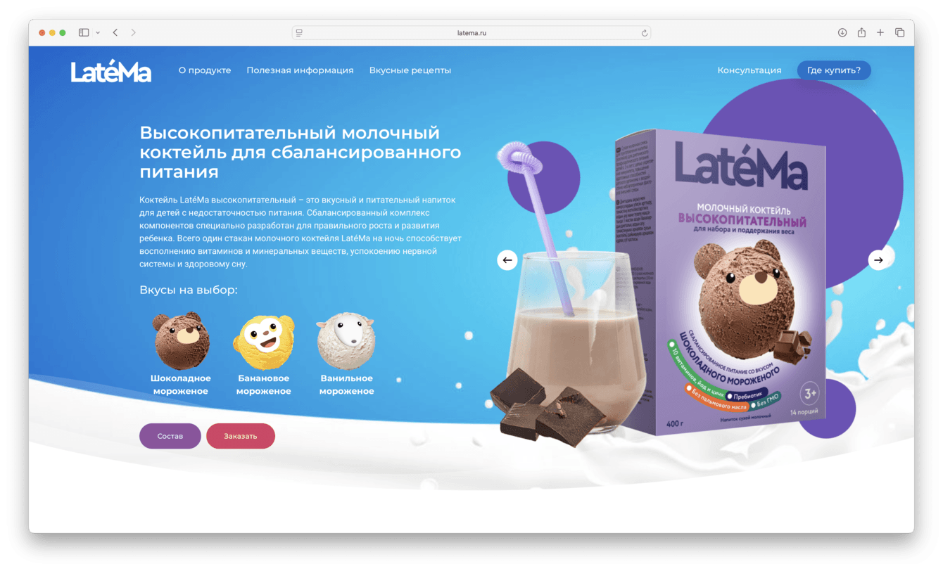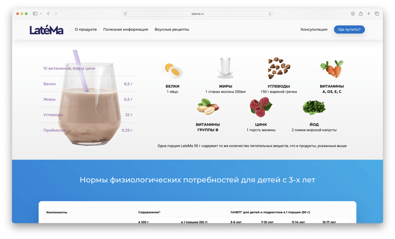 Разработка промо-сайта для бренда LateMa. Яркий дизайн и подробная информация о полезных свойствах детского питания дополняющего рацион.