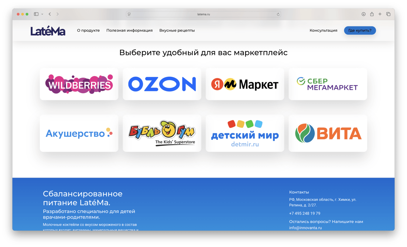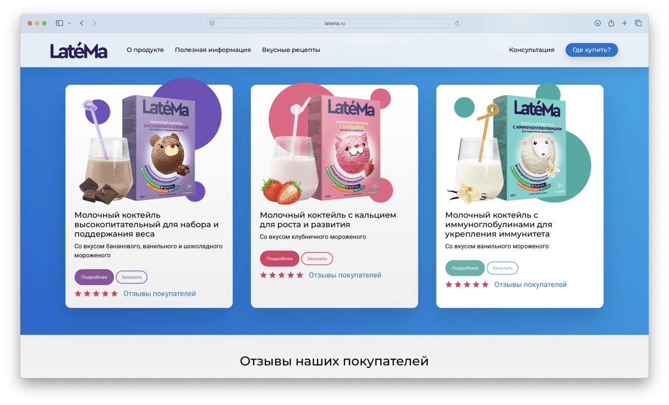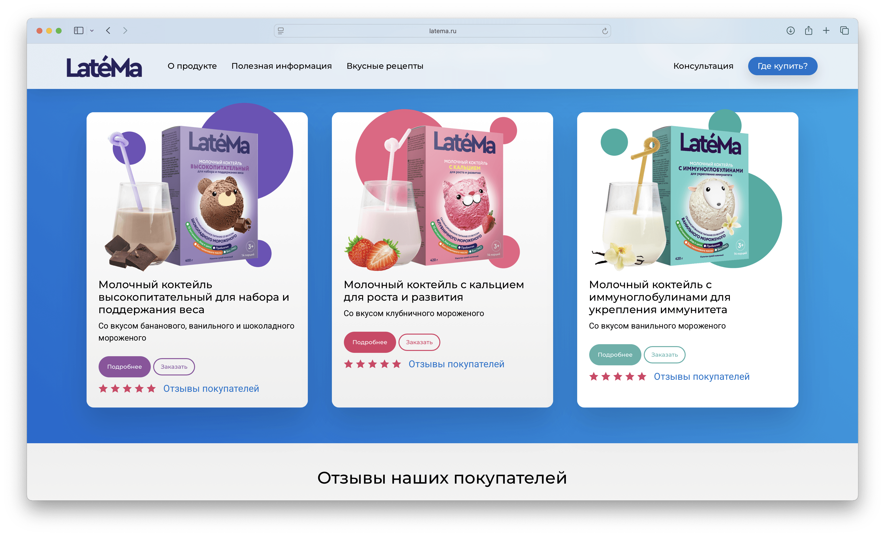 Разработка промо-сайта для бренда LateMa. Яркий дизайн и подробная информация о полезных свойствах детского питания дополняющего рацион.