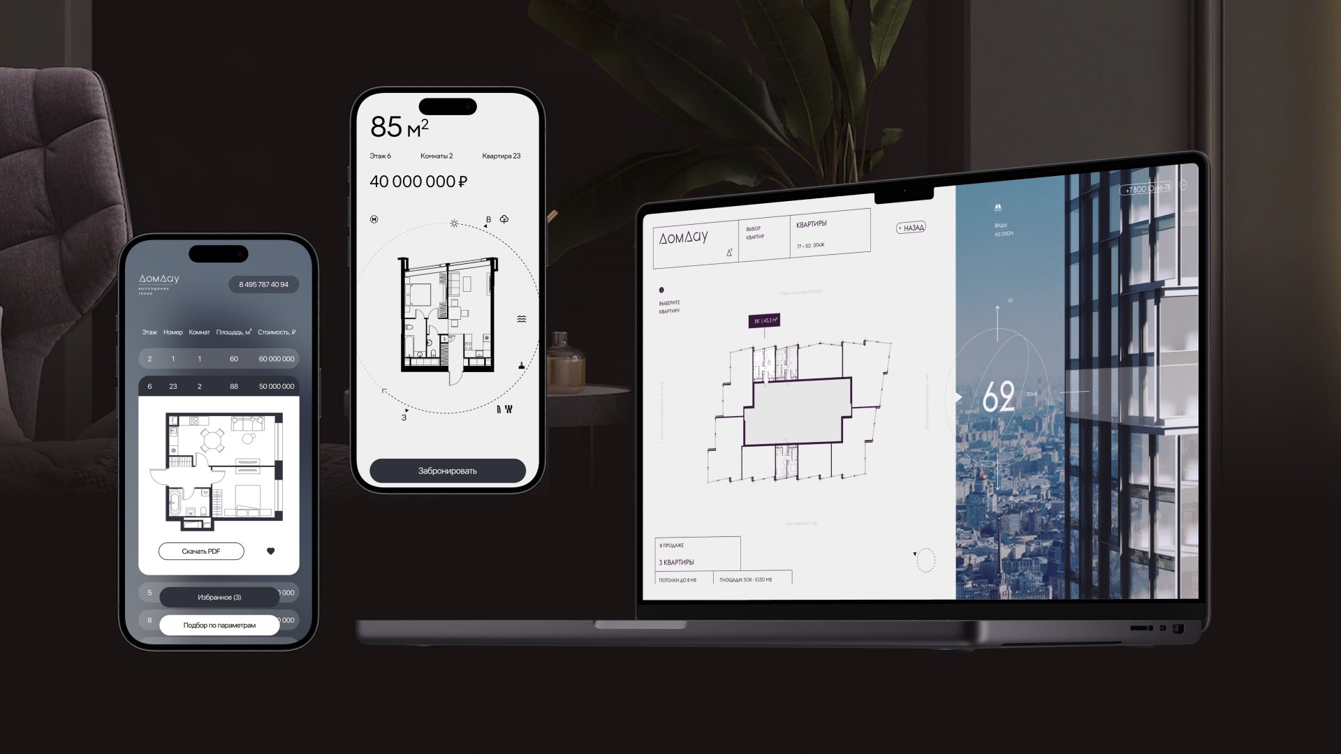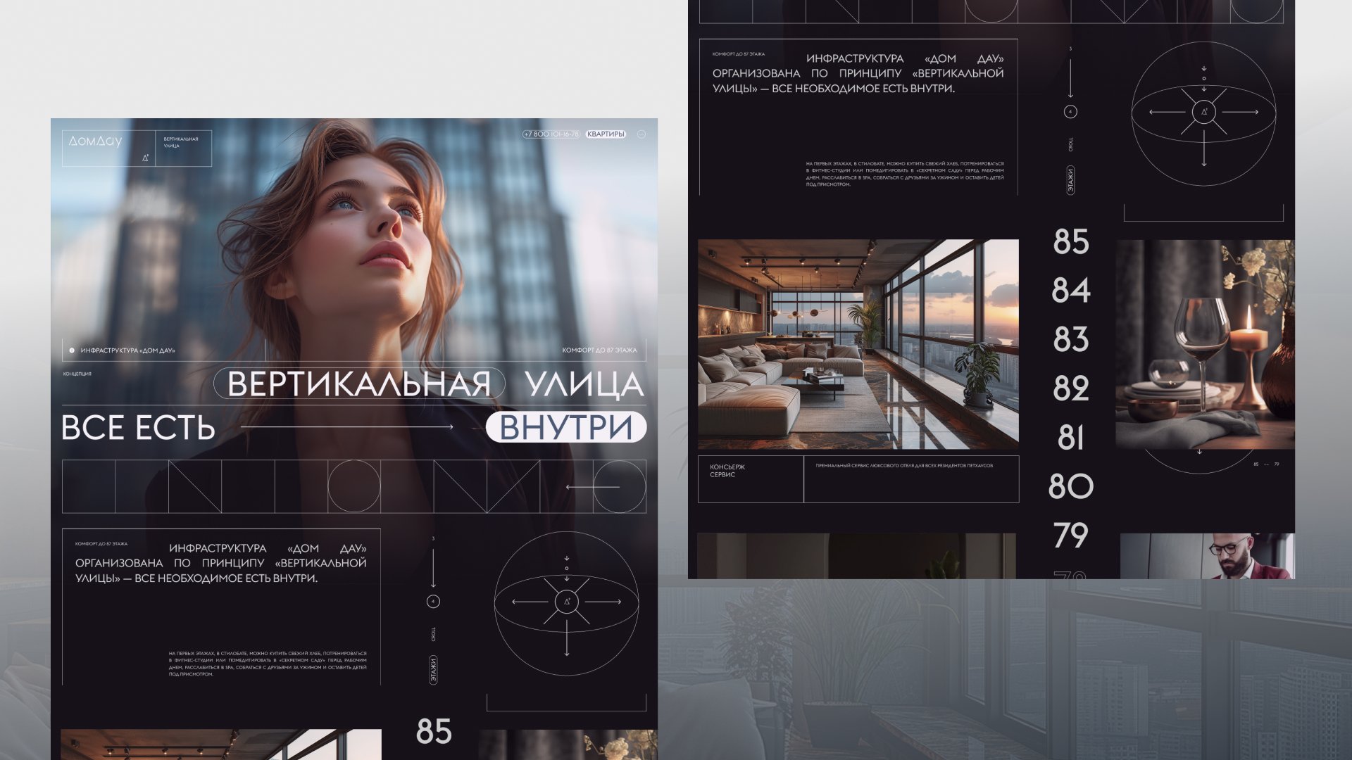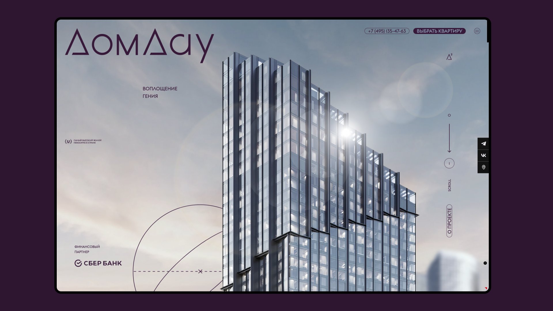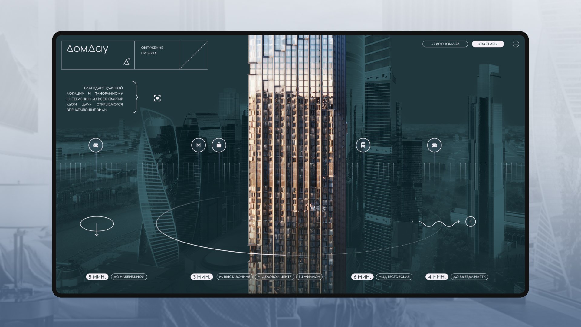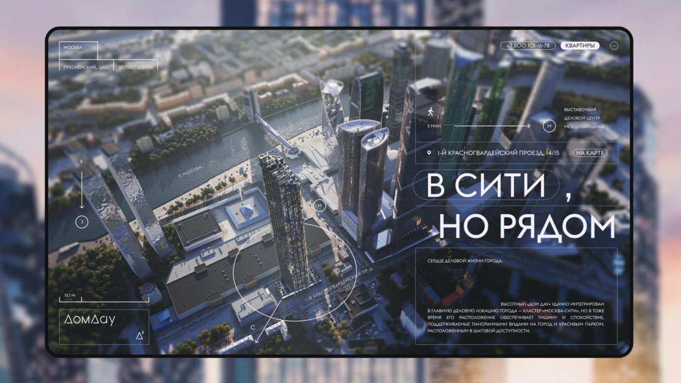 Создать полнофункциональный основанный на эффектных 3D-визуализациях сайт премиального небоскреба «Дом Дау» к старту продаж.