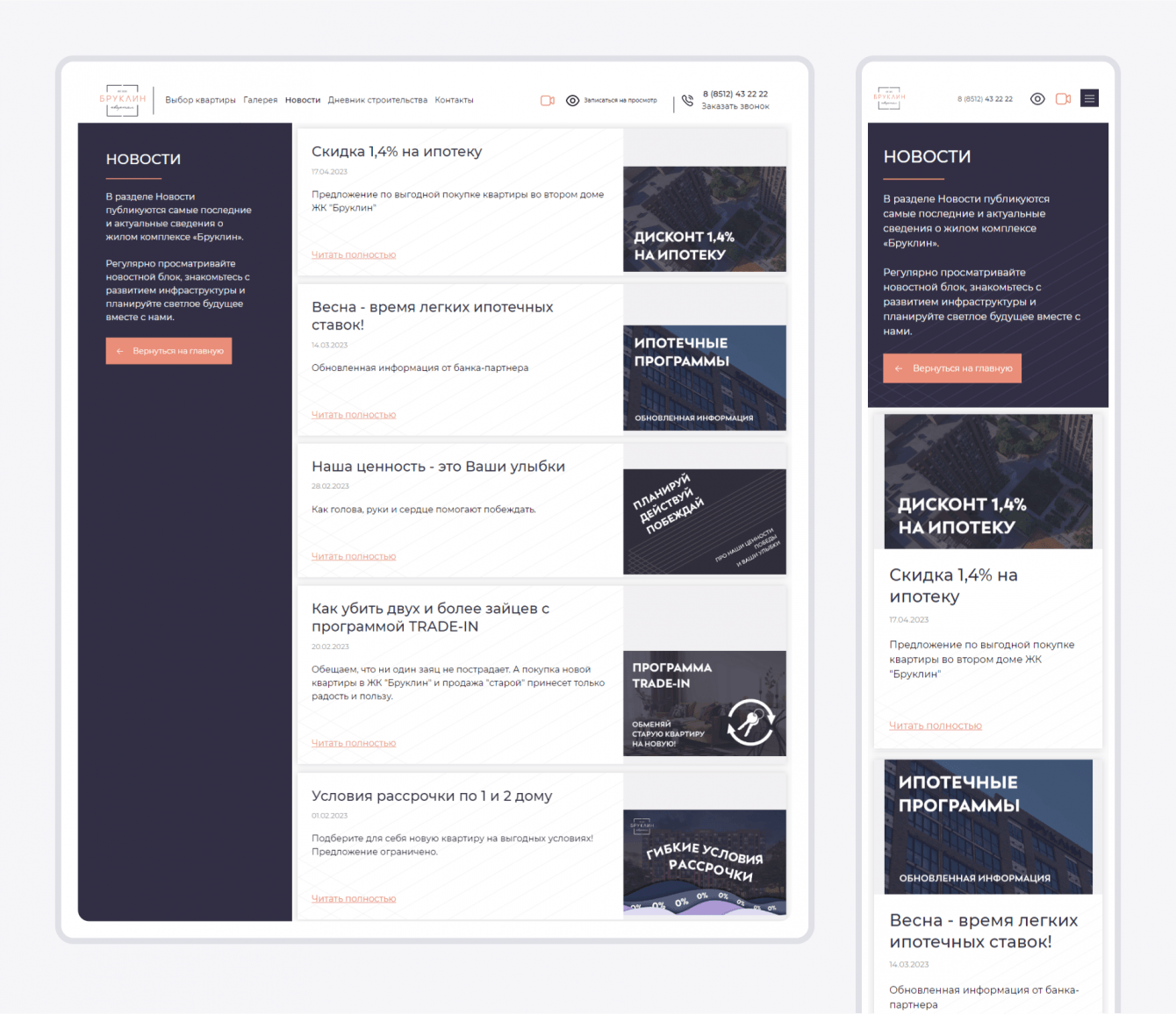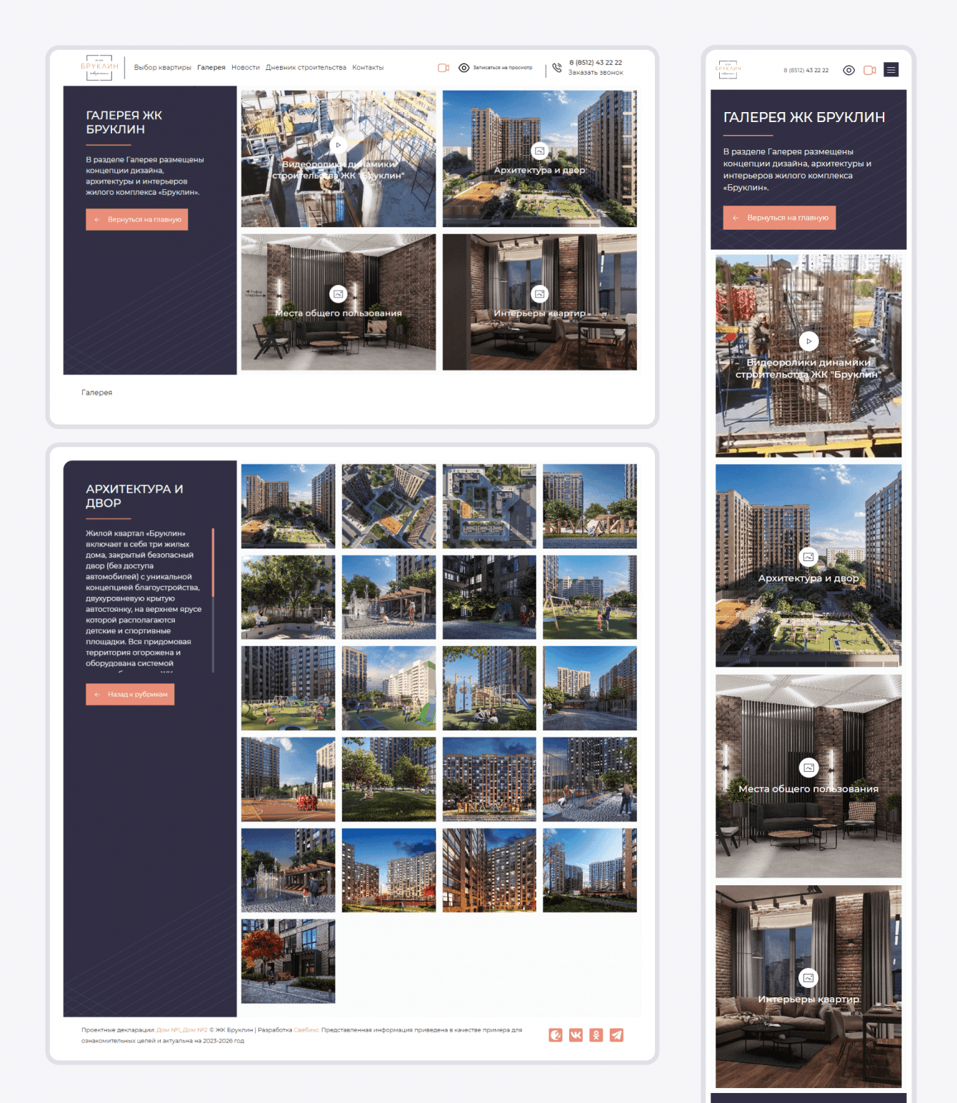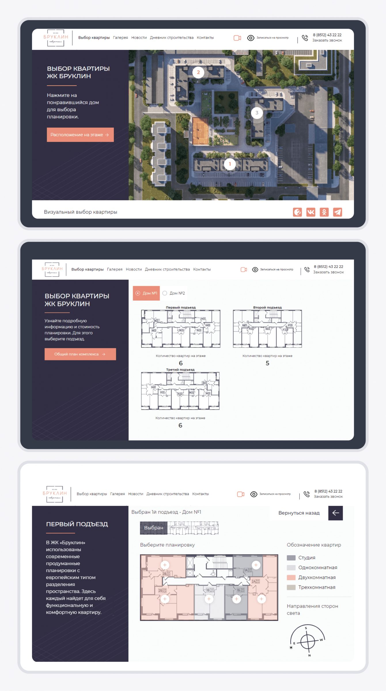 Выбор квартиры на проекте реализован посредством визуального выбора в упрощенной версии, т.к. объект состоит из небольшого количества строений и не имеет деления на секции.