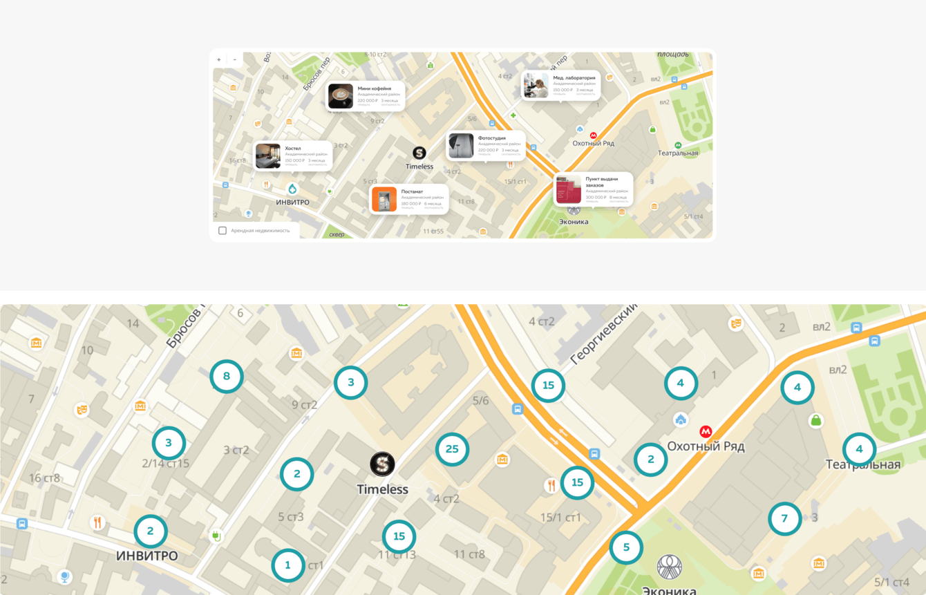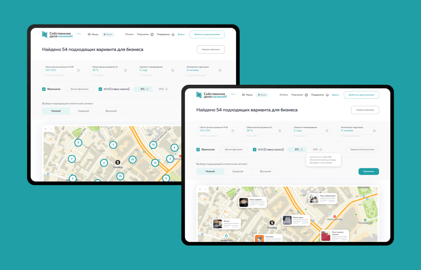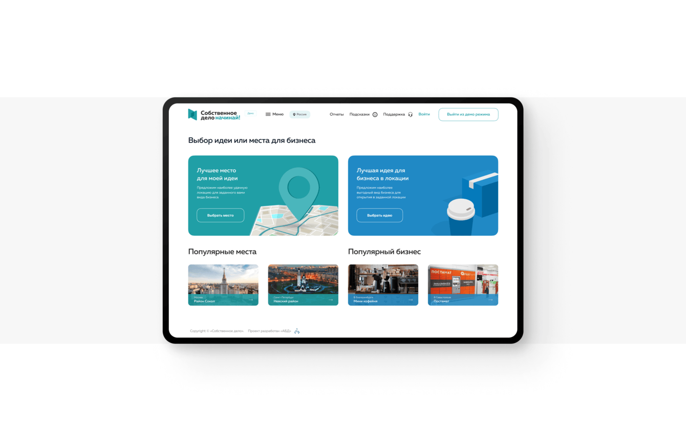 Показывает локации максимально подходящие для реализации собственной идеи.