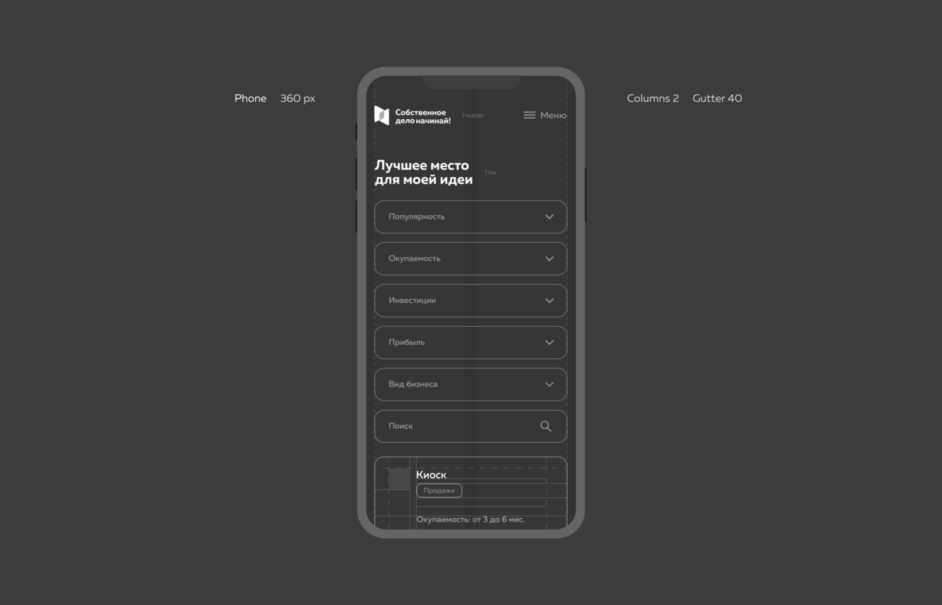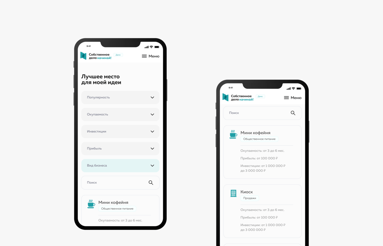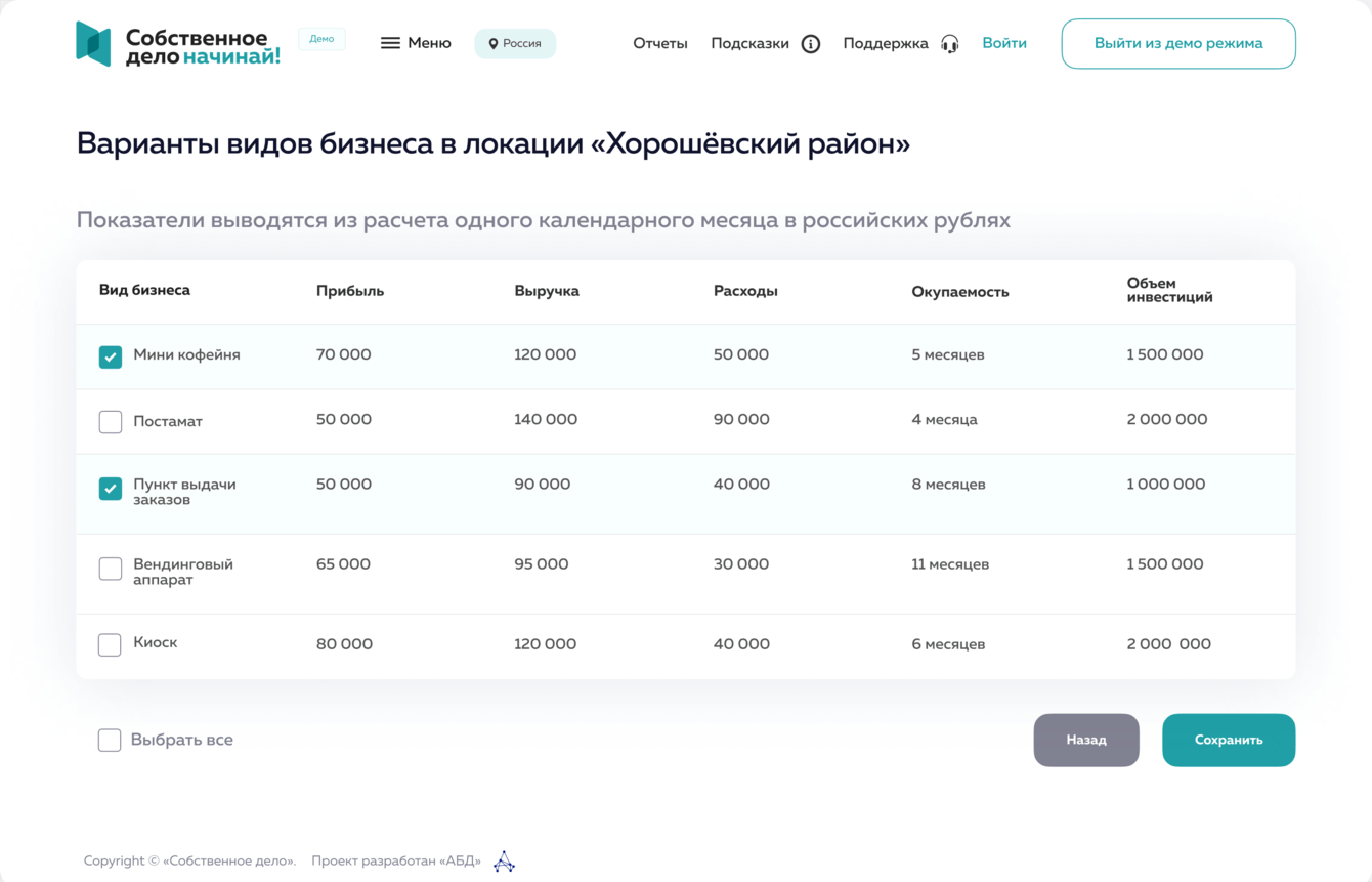 Показывает локации максимально подходящие для реализации собственной идеи.