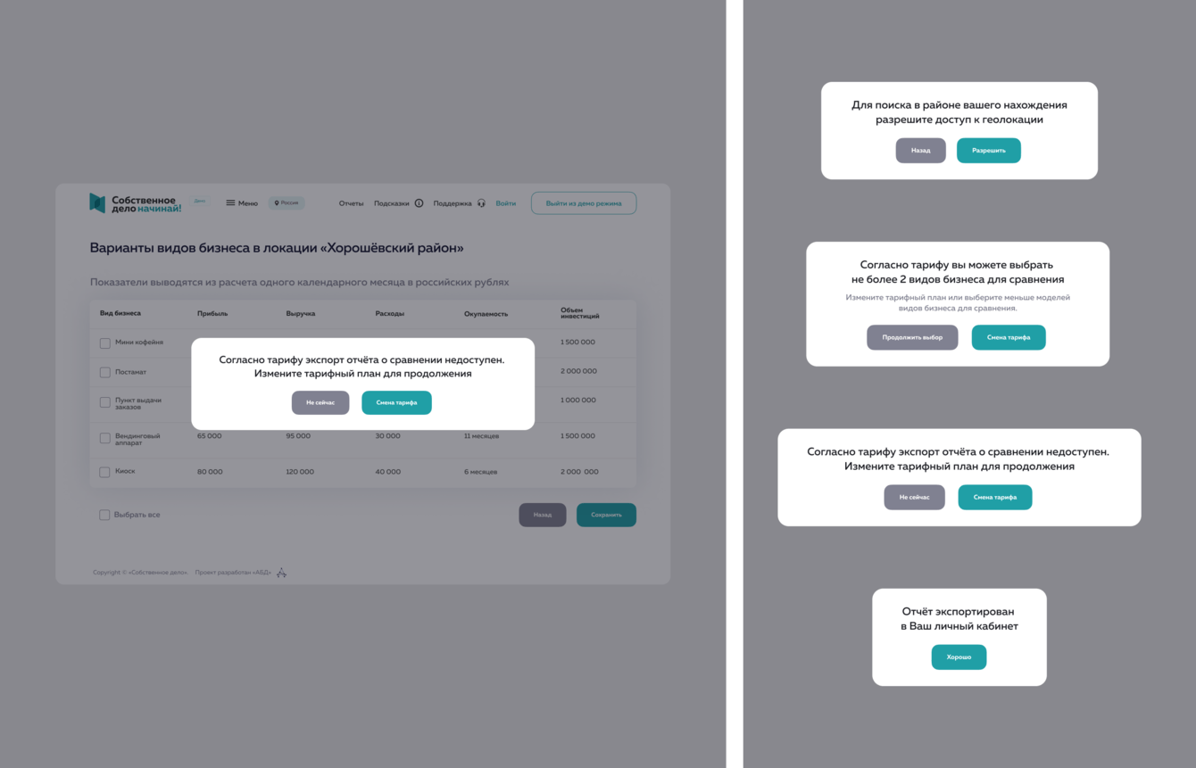 Как правило в интерфейсе не обходится без технических, но не менее важных элементов и блоков. Для проекта мы разработали более 500 вспомогательных элементов для всех необходимых условий.