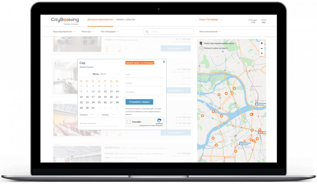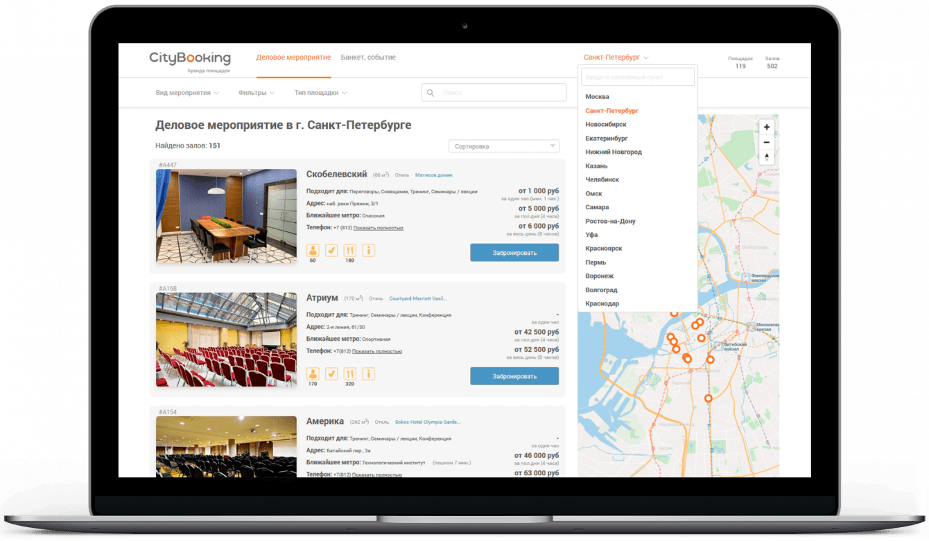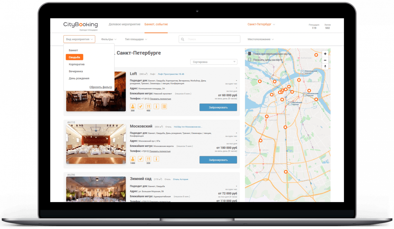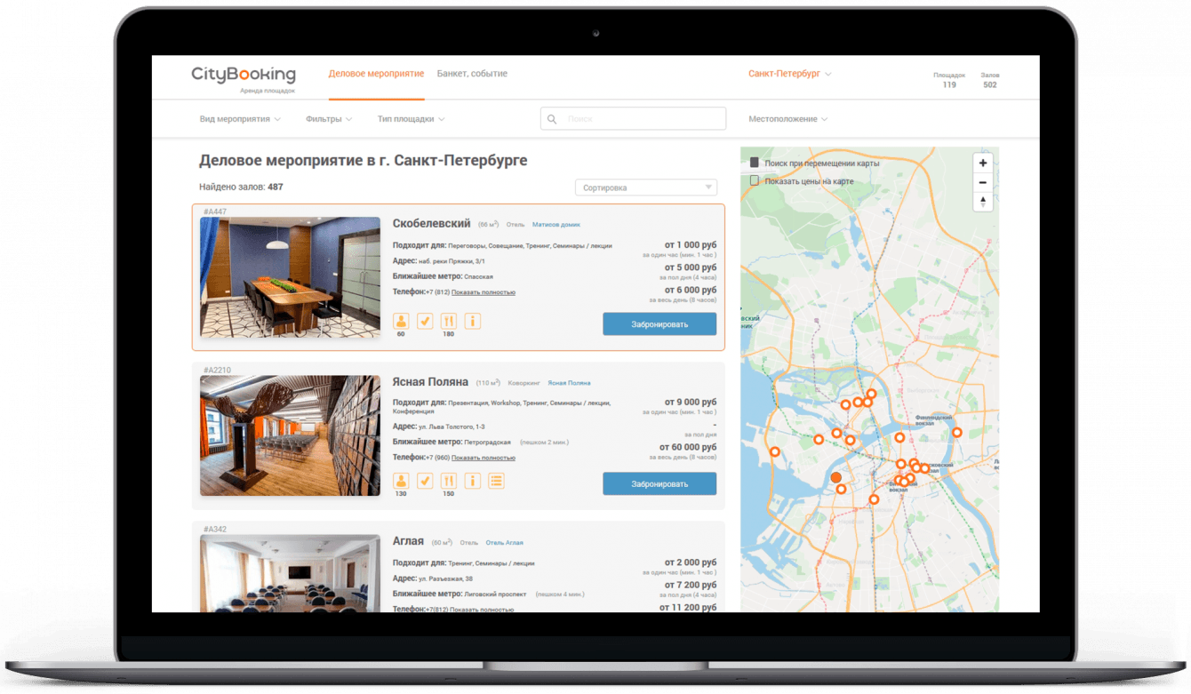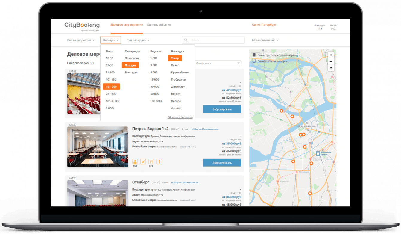 Сайт, который представляет собой базу данных площадок Санкт-Петербурга, предоставляющих услуги аренды конференц-залов и переговорных, и системой фильтрации для поиска зала по параметрам
