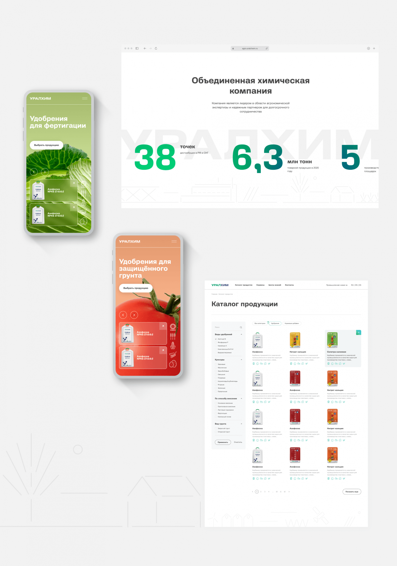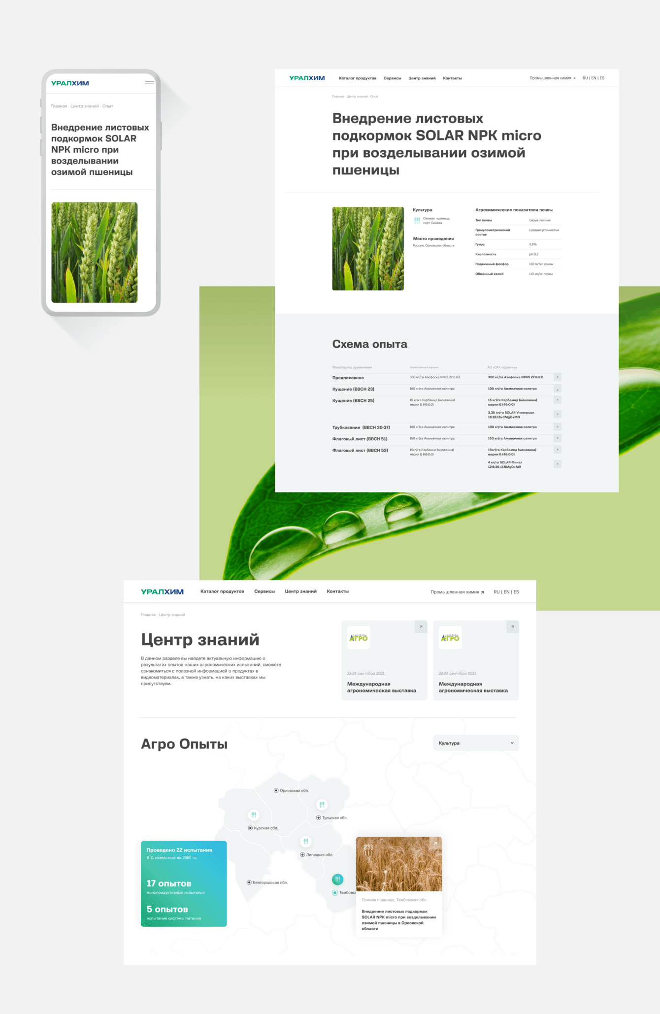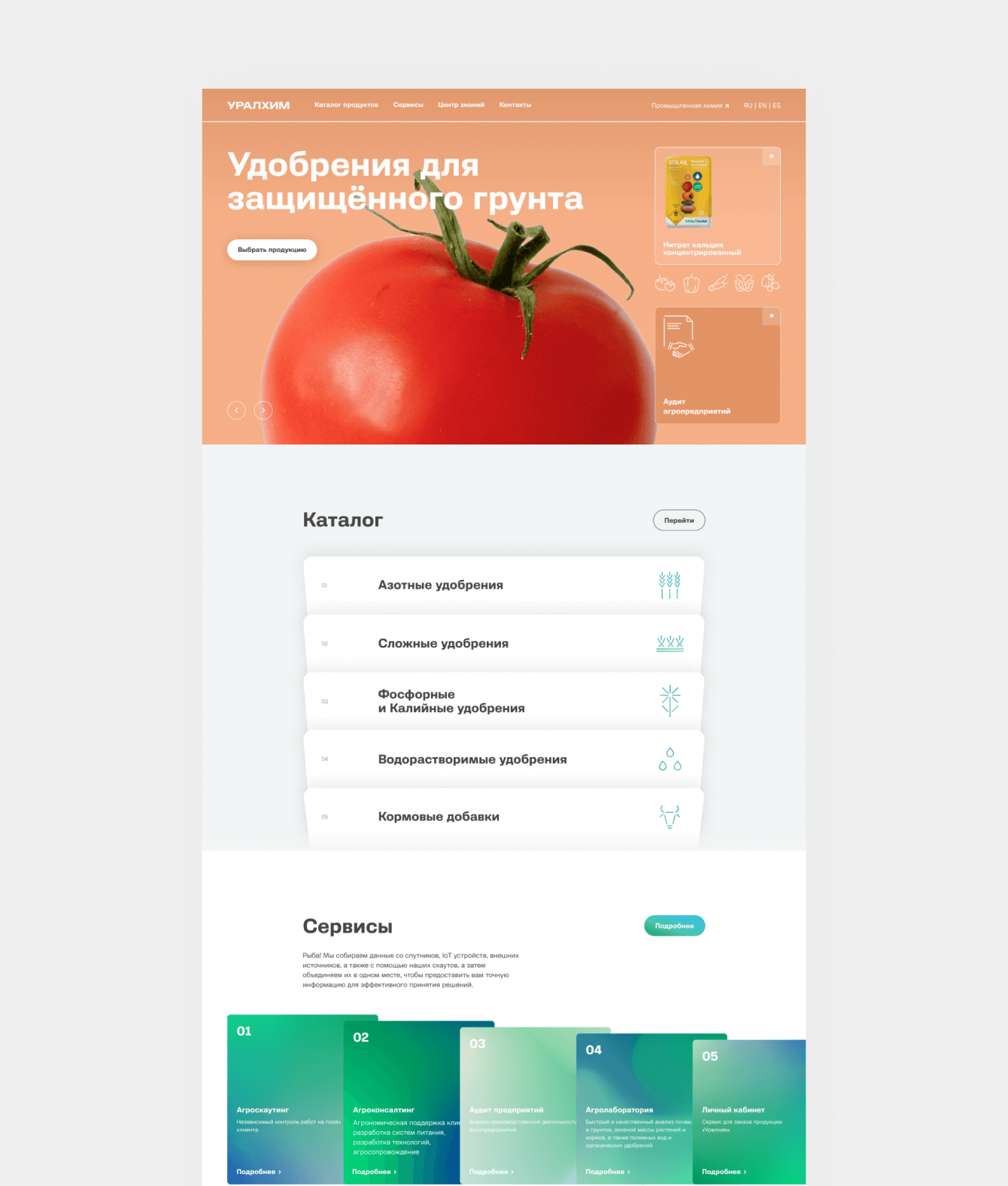 Основная задача сайта — привлечение новых потребителей и продажа продукции компании. Помимо высокоэффективных видов удобрений, Уралхим предлагает комплексные решения для аграрного бизнеса, основанные на обширном опыте в сельском хозяйстве и развитии цифровизации. Для того чтобы в полной мере отразить ценностное предложение компании, важно было структурировано подать информацию, сделать сайт визуально приятным и удобным для использования.