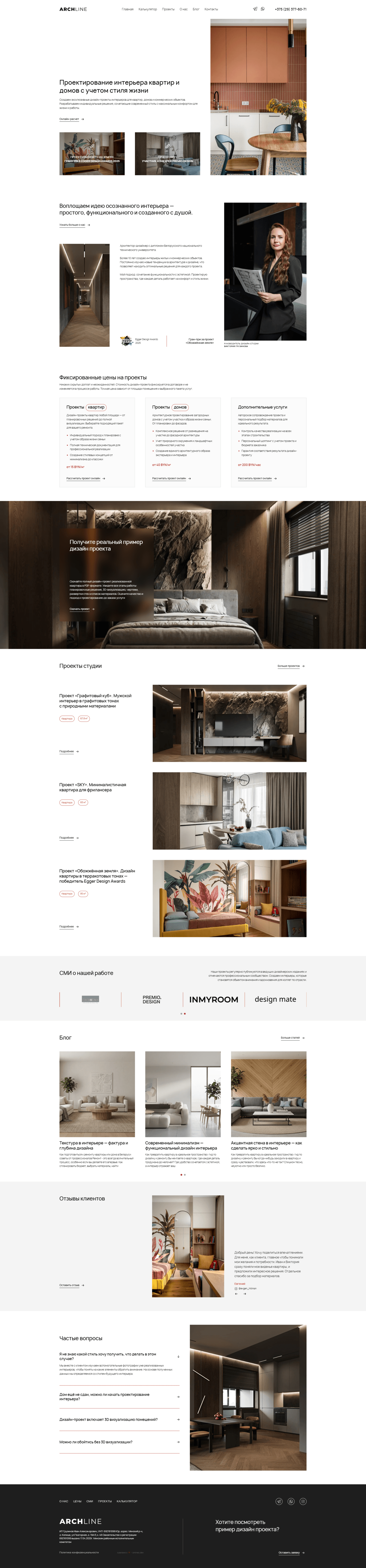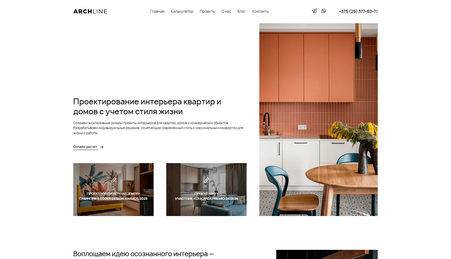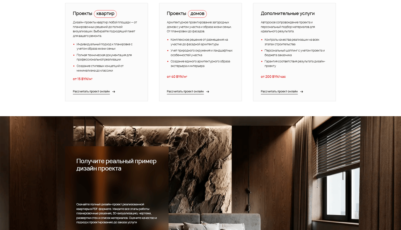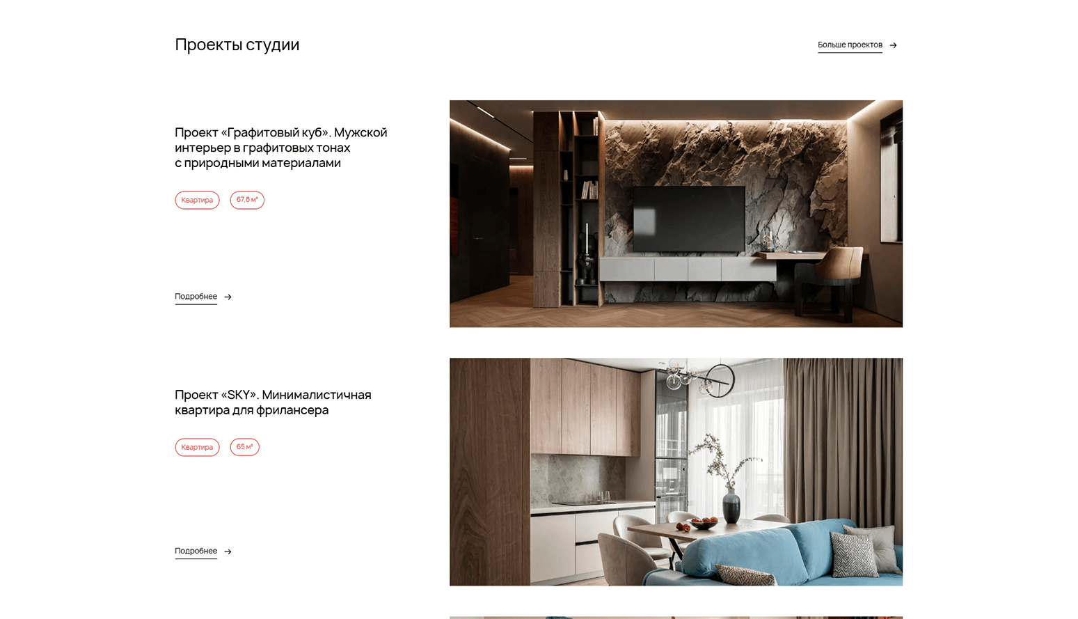 Обновленное портфолио с фильтрами: удобная навигация по проектам квартир и домов, быстрые превью и скачиваемые кейсы.