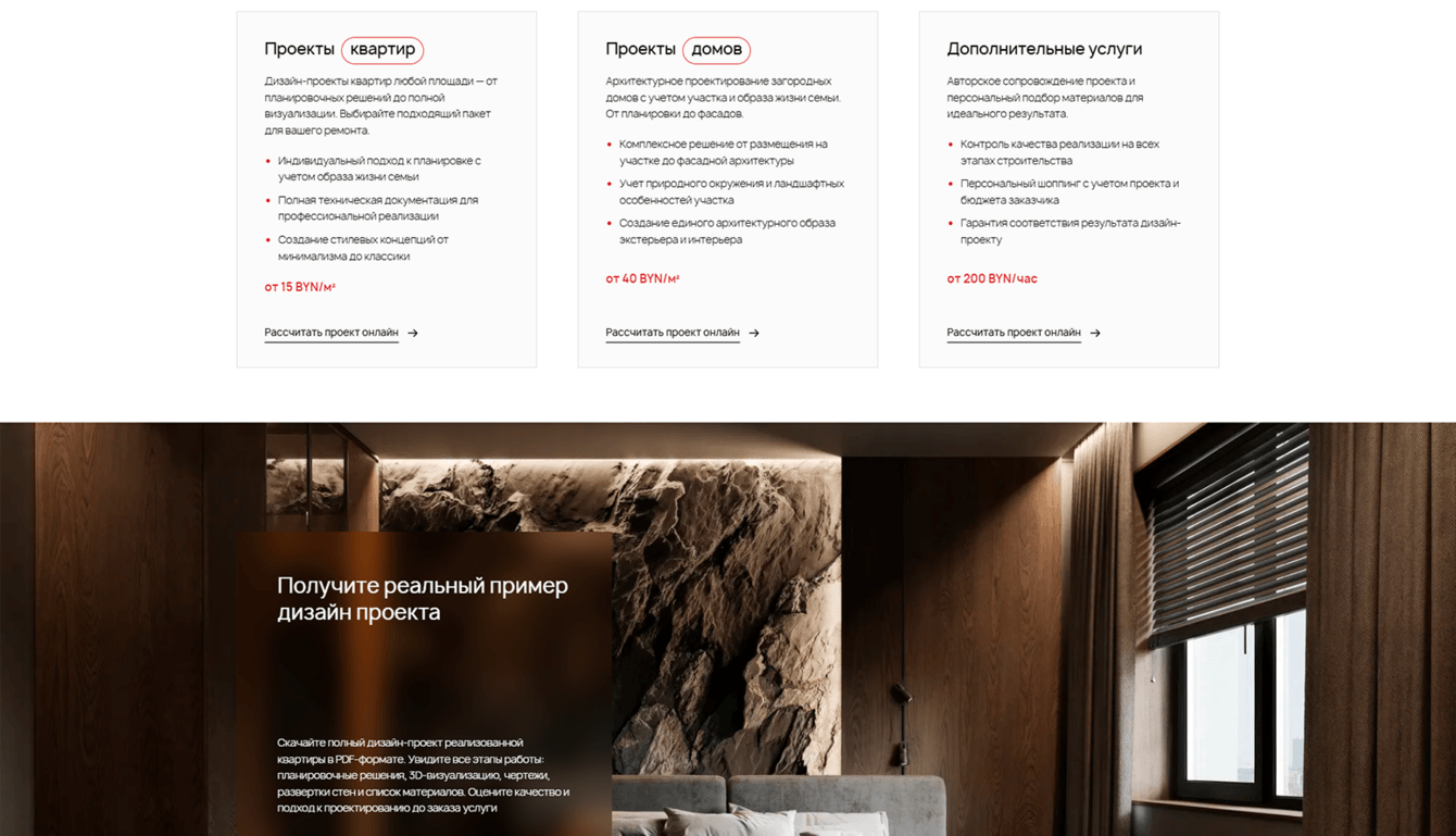 Онлайн-калькулятор проекта: интерактивная форма расчета стоимости дизайна в зависимости от площади, типа помещения и выбранного набора услуг, с интеграцией в запросы на обратную связь.