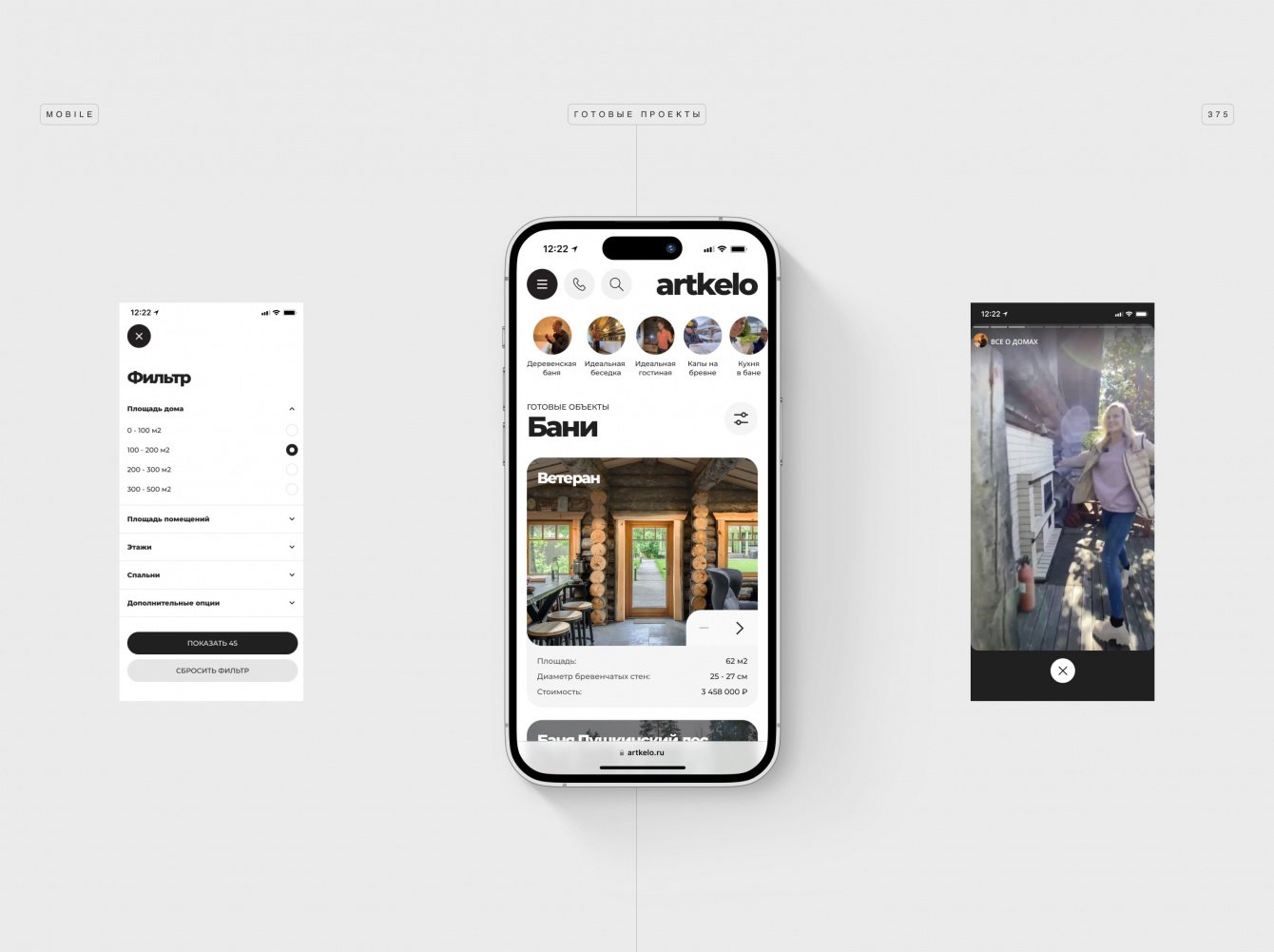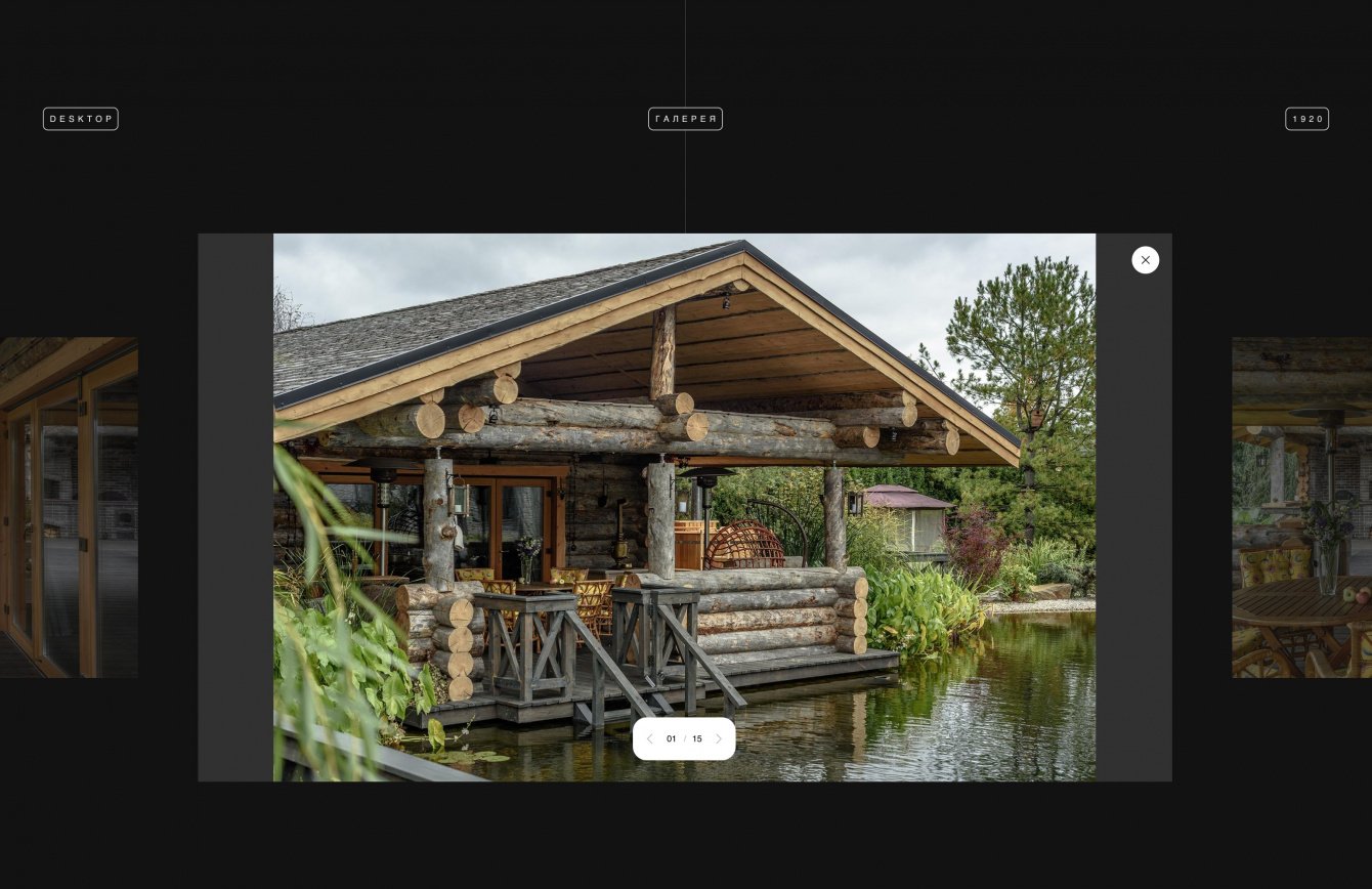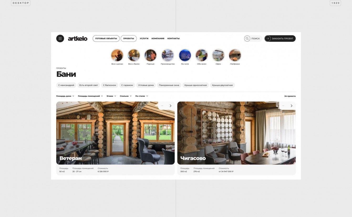 Портфолио готовых объектов. Все объекты разделены на 4 категории: «Дома», «Бани», «Для бизнеса», «Для души». В каждой категории есть сложные фильтры. Пользователь может найти подходящий объект по площади, стилю, количеству этажей или спален.