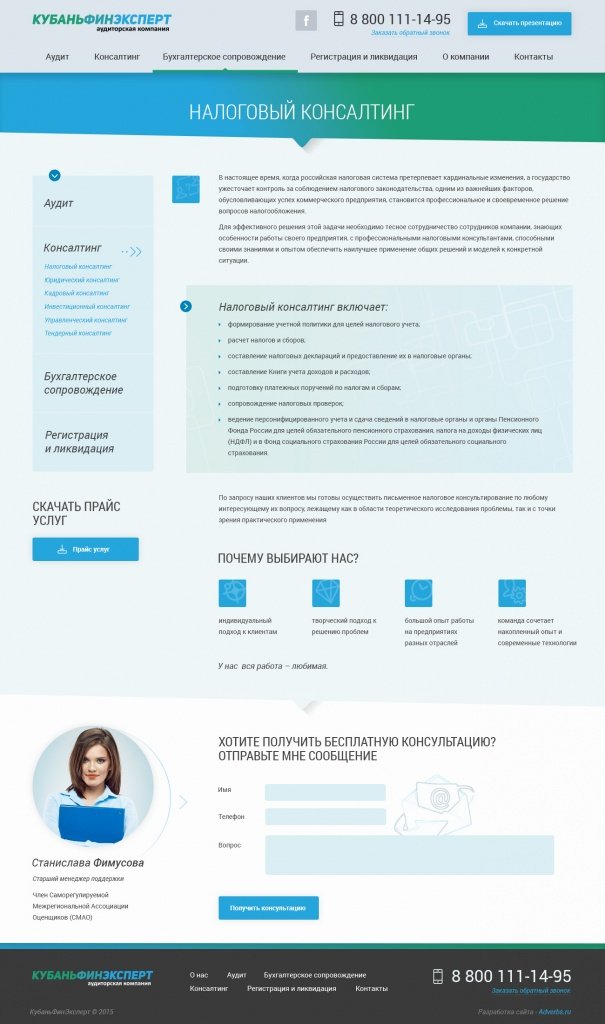 При том, что акцент на ценах не делается на сайте, на любой странице можно скачать прайс услуг, обратиться к эксперту за помощью и даже заполнить анкету и получить подробный расчёт стоимости самой сложной услуги аудита компании.