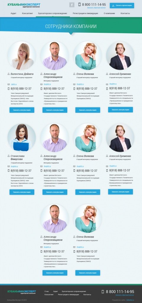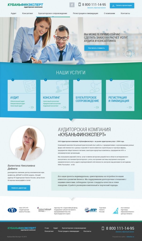 Мы сделали акцент на персоне генерального директора и партнёрах компании. Именно это является основным конкурентным преимуществом . Конкуренты компании в первую очередь говорят о стоимости услуг и скидках, мы пошли иным путём и сделали ставку на подробном описании услуг и компетенции сотрудников.