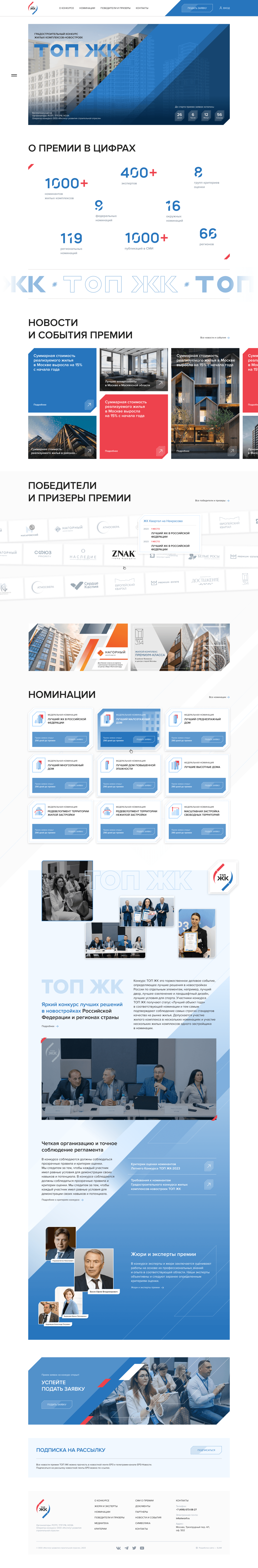 Новый сайт ТОП ЖК совмещает в себе информацию об основном конкурсе, а также о Летнем ТОП ЖК. Всего одним кликом в админке менеджер может включить нужный шаблон главной страницы и счетчик обратного отсчета.