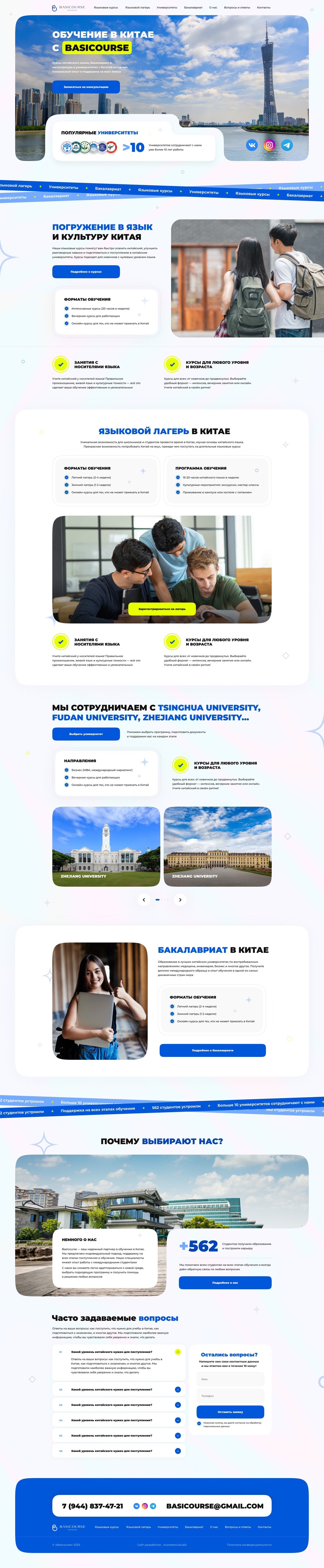 Контент выстроен вокруг эмоции, мотивации и перспектив. Вместо перегруженных блоков — чёткие, последовательные акценты на преимуществах обучения в Китае, историях студентов, карьерных возможностях и поддержке от Basicourse. Всё направлено на то, чтобы студент или родитель почувствовали: они в надёжных руках.