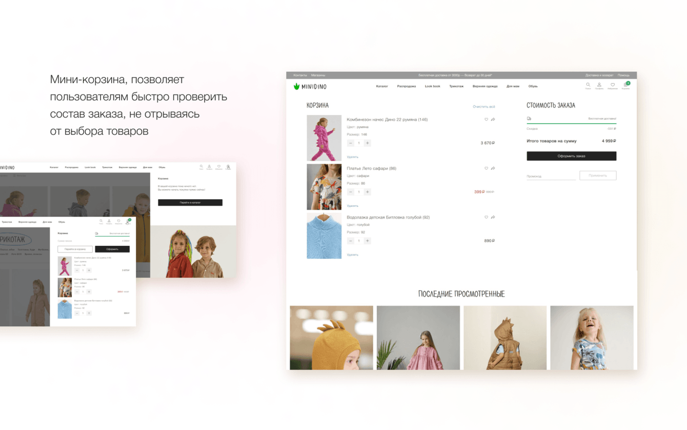 В нижней части корзины добавлен блок с просмотренными и сопутствующими товарами, что способствует увеличению конверсии продаж.