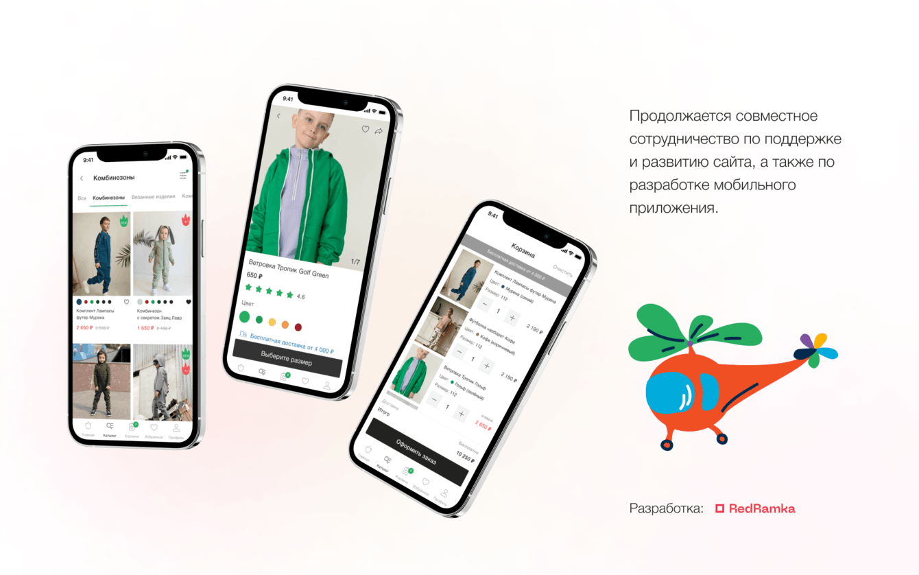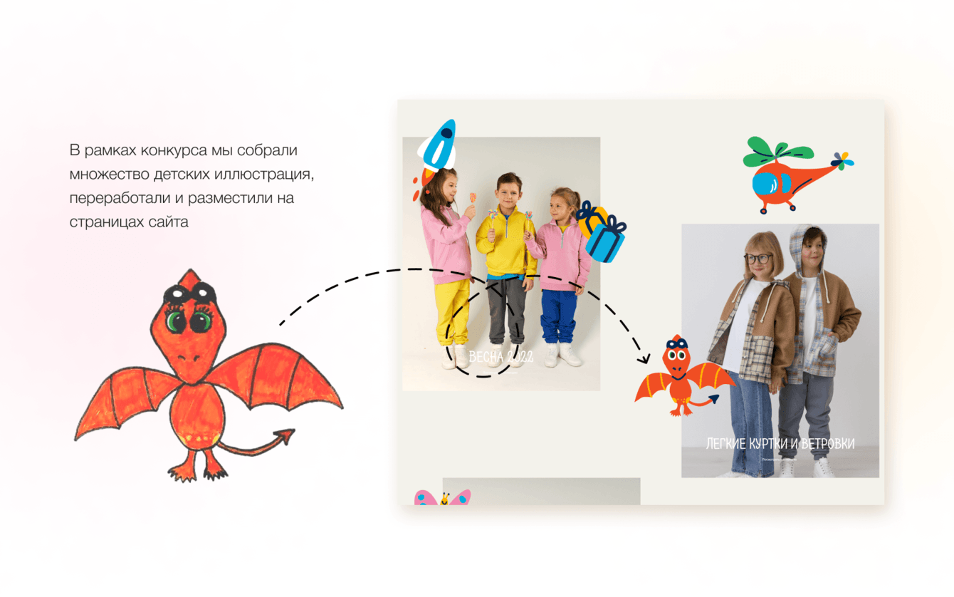 Учитывая специфику целевой аудитории, мы дополнили функциональные блоки оцифрованными детскими иллюстрациями. Главная фишка — иллюстрации созданы по детским рисункам с творческого конкурса, который проводился в социальных сетях бренда.