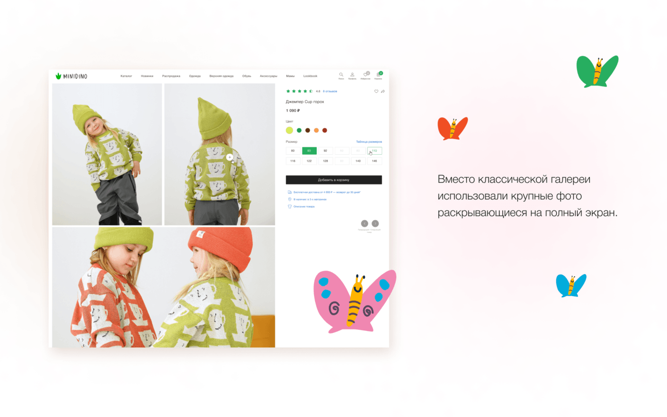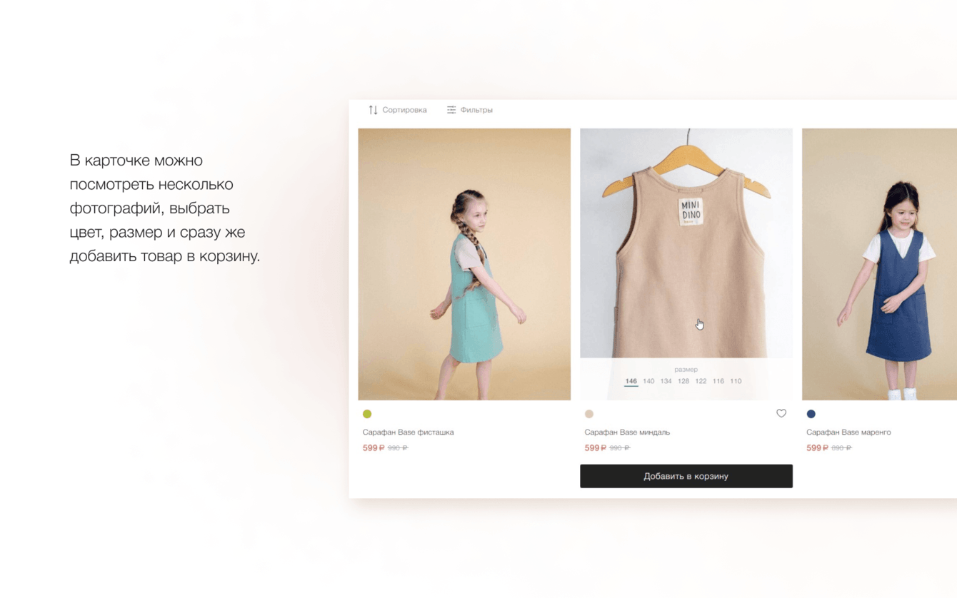 В каталоге сделан упор на визуализацию товара, что выражается в увеличенных изображениях. А фильтрация и сортировка делают покупки более комфортными и быстрыми.