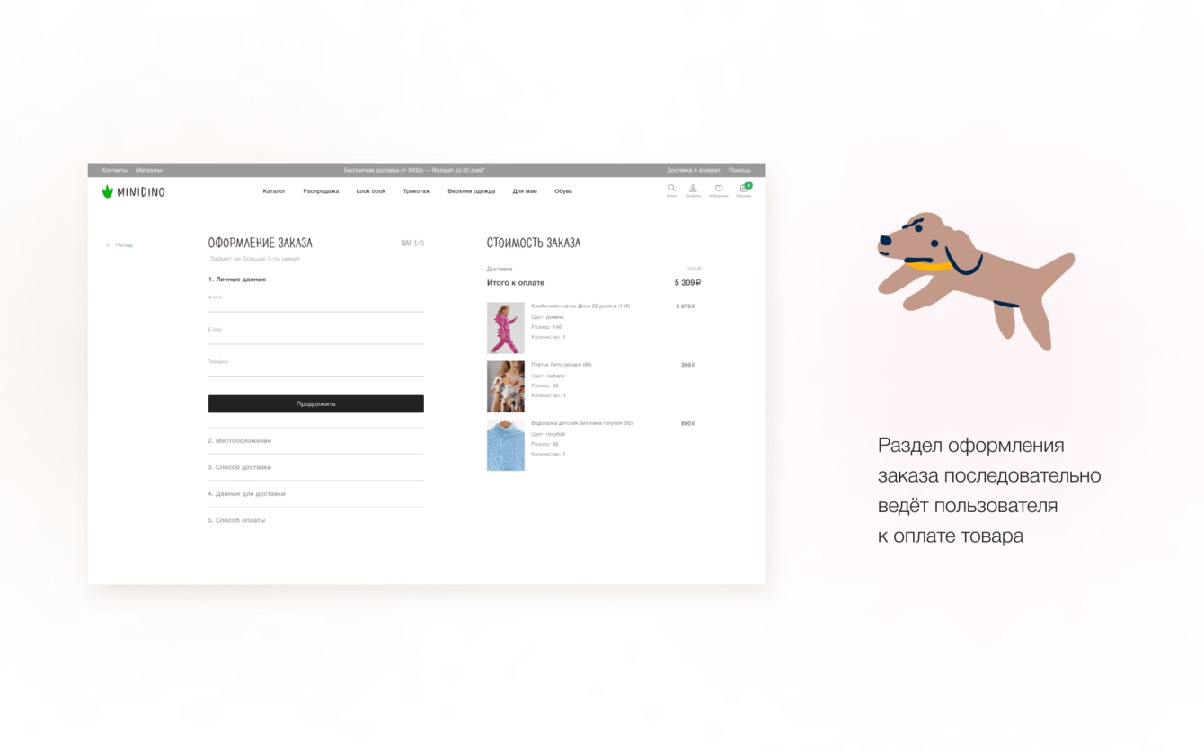 Функция оформления заказа спроектирована оптимальным способом для быстрого заполнения необходимых данных для доставки. После совершения первой покупки все данные запоминаются и хранятся в личном кабинете пользователя.