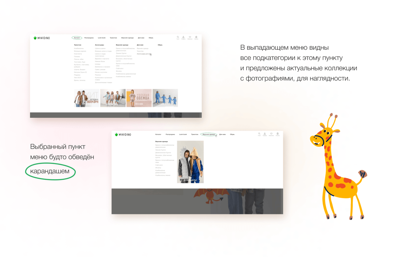 Для удобства пользователей нами разработана система навигации в виде выпадающего блока для каждого пункта меню. Блок содержит не только навигацию, но и изображения сопутствующих категорий.