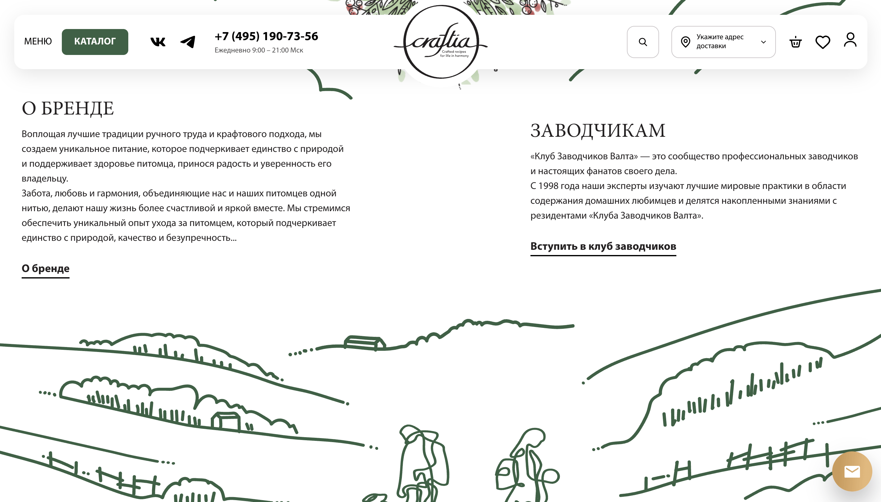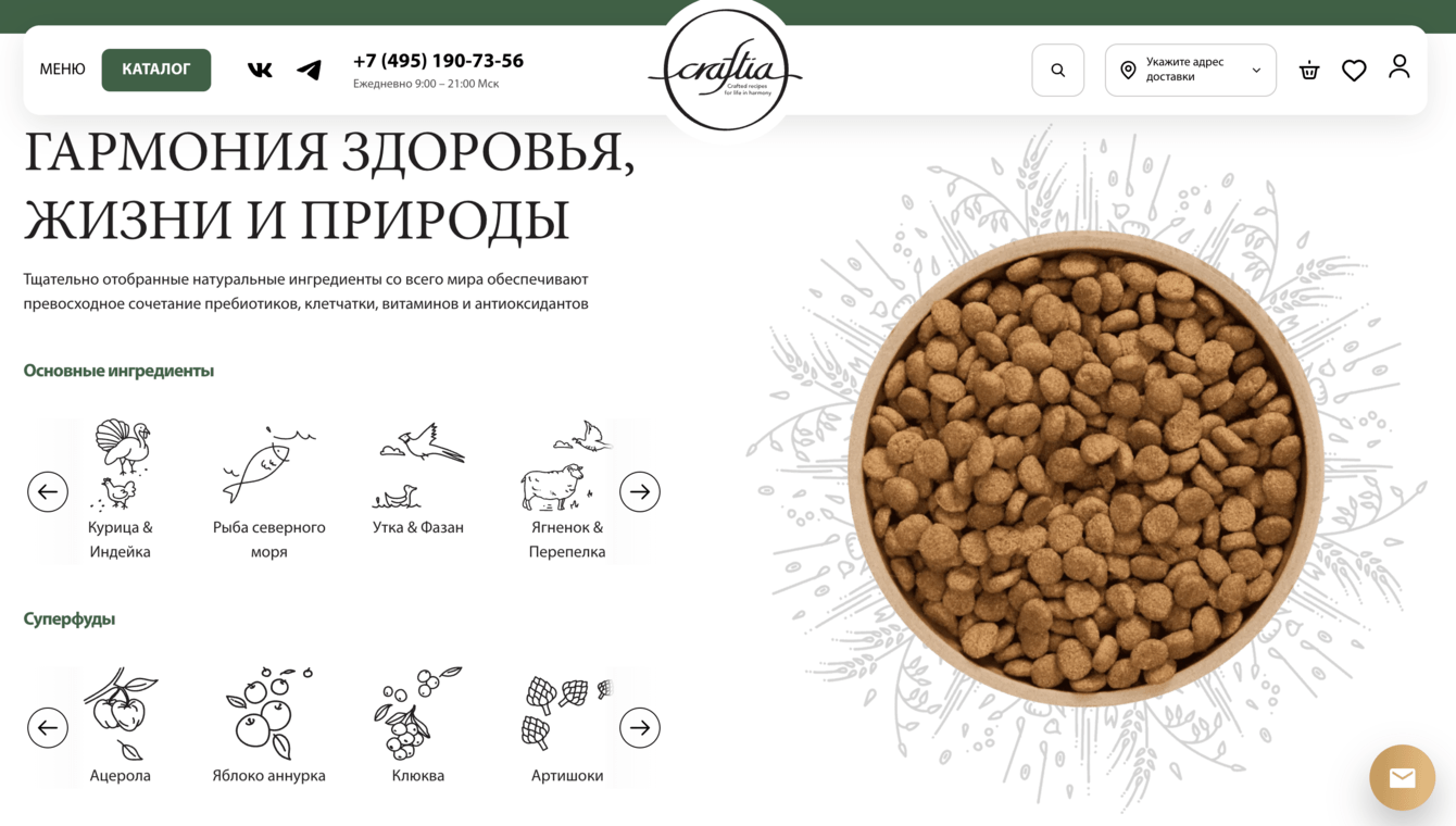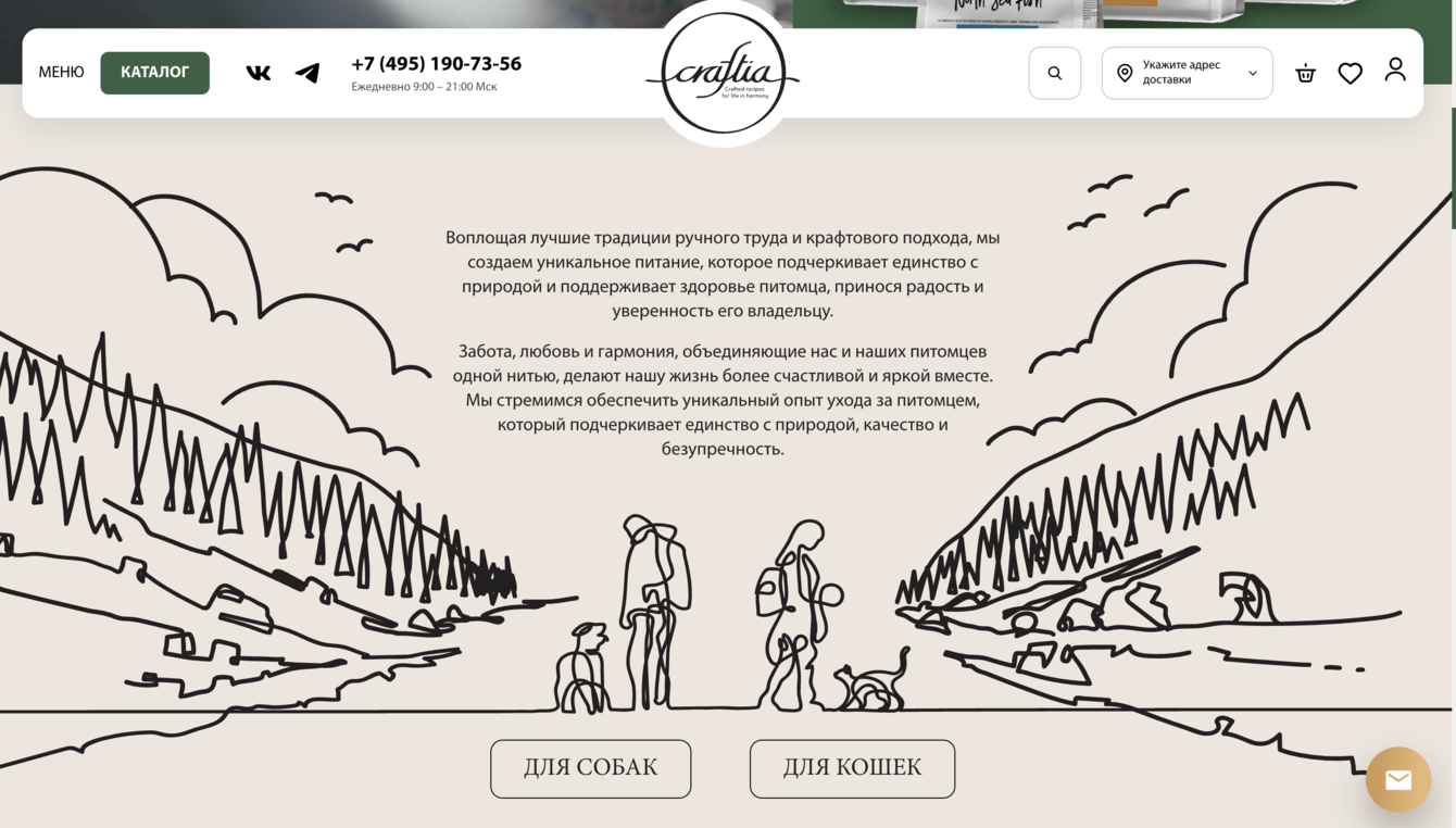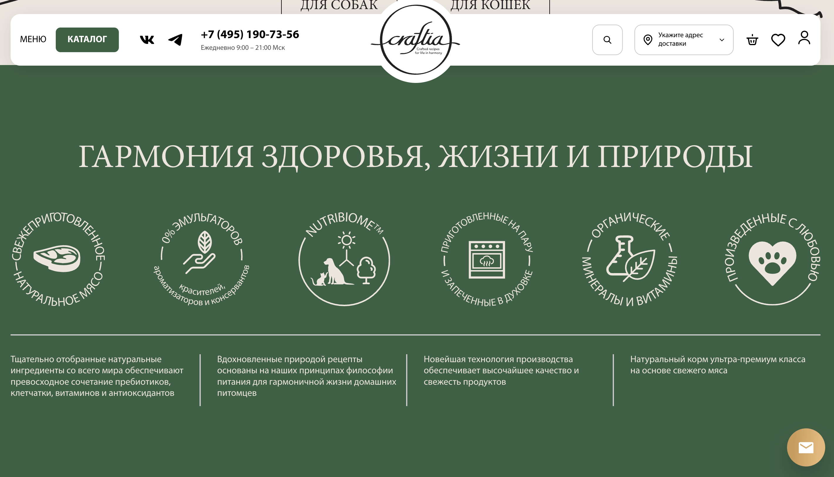 Craftia — молодой российский бренд премиального питания для домашних животных с акцентом на экологичность и локальное производство. Наша задача — разработать сайт, который транслирует ценности бренда: заботу, осознанность и современный подход к питанию.
