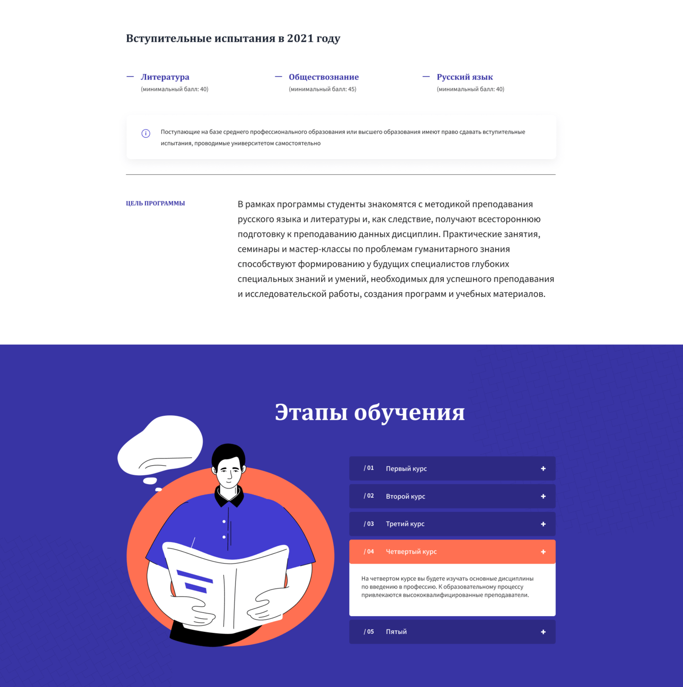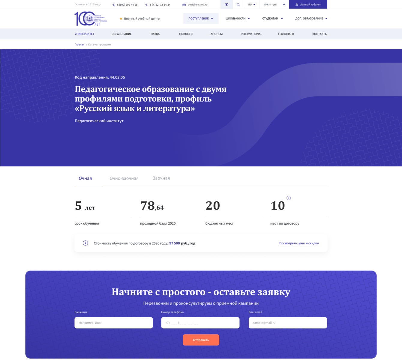 На первом экране мы расположили название и универсальный баннер, вторым блоком ключевую и самую популярную информацию: какие возможны формы обучения, сколько учиться, сколько нужно баллов, сколько мест по договору и самое важное сколько стоит. Ключевую информацию отделяем CTA-формой.