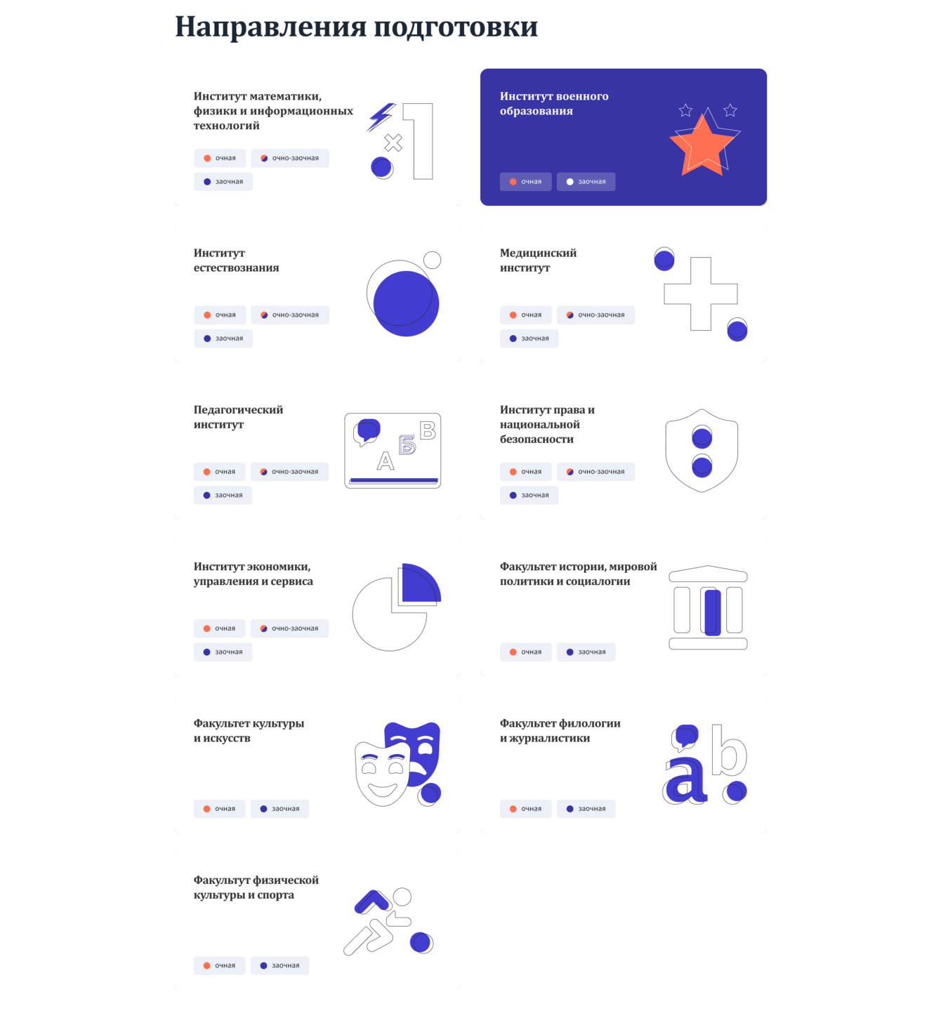 Для каждого института разработали уникальную иконку. Тегами вывели формы обучения: очно, очно-заочно, заочно