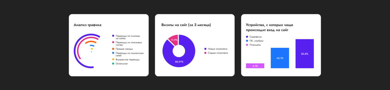 В первую очередь мы провели серьезную аналитику и аудит сайта, выявили ключевые метрики, которые показали поведение пользователей на сайте, количество новых посетителей, процент отказов и процент использования сайта с разных устройств.