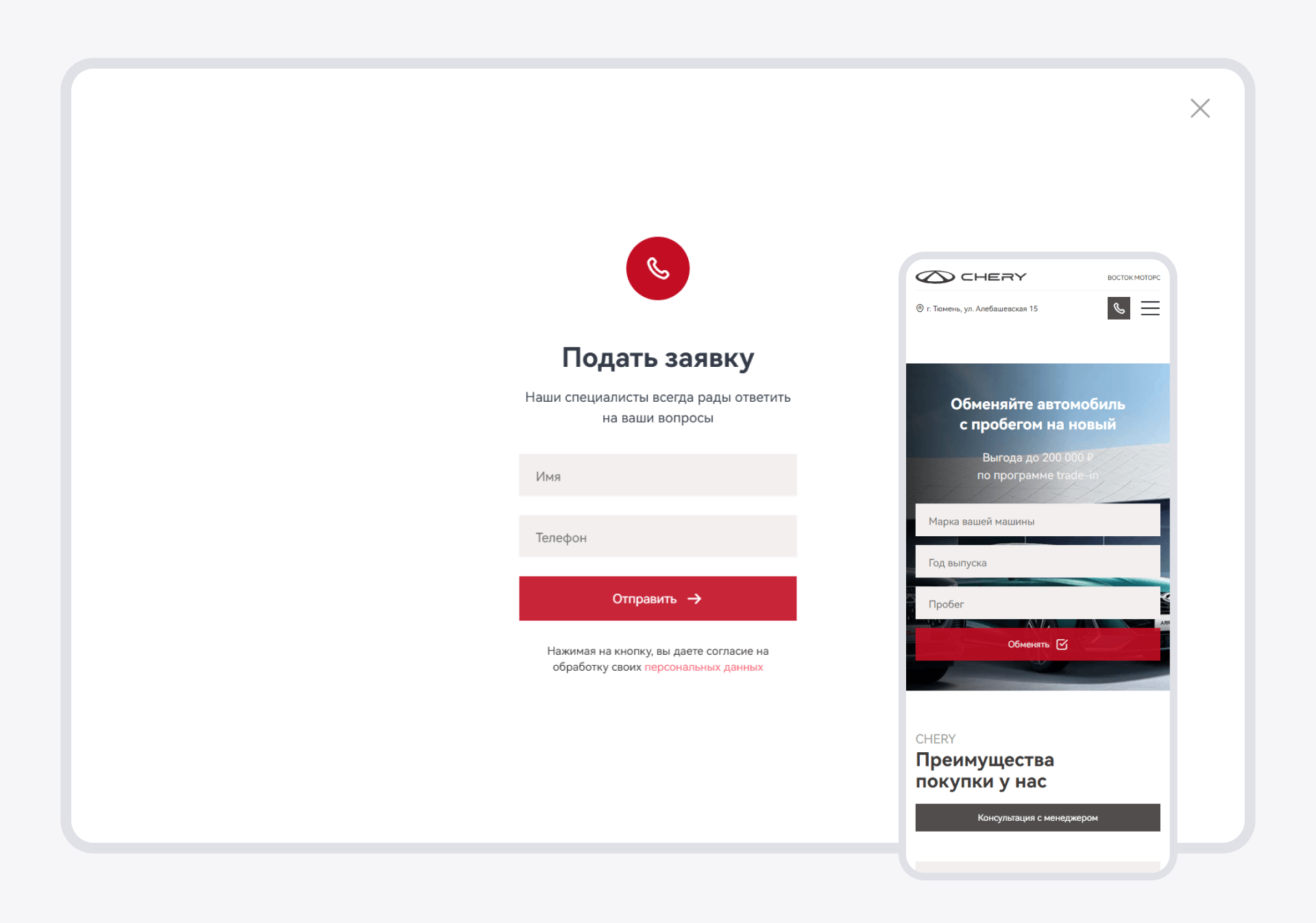 Посадочная страница для автодилера Восток Моторс Chery выполнена в фирменных цветах бренда с акцентом на легкость восприятия и лаконичность. Интуитивные блоки call-to-action превращают интерес в заявку за пару касаний. Специально разработанный акционный блок не только демонстрирует выгодные предложения, но и показывает обратный отсчет до окончания акции, создавая эффект срочности.