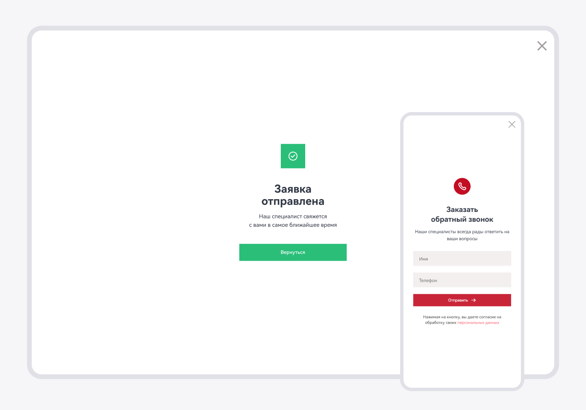 Форма подачи заявки включает обязательные поля "Имя" и "Телефон", данные из которых автоматически передаются в CRM-систему