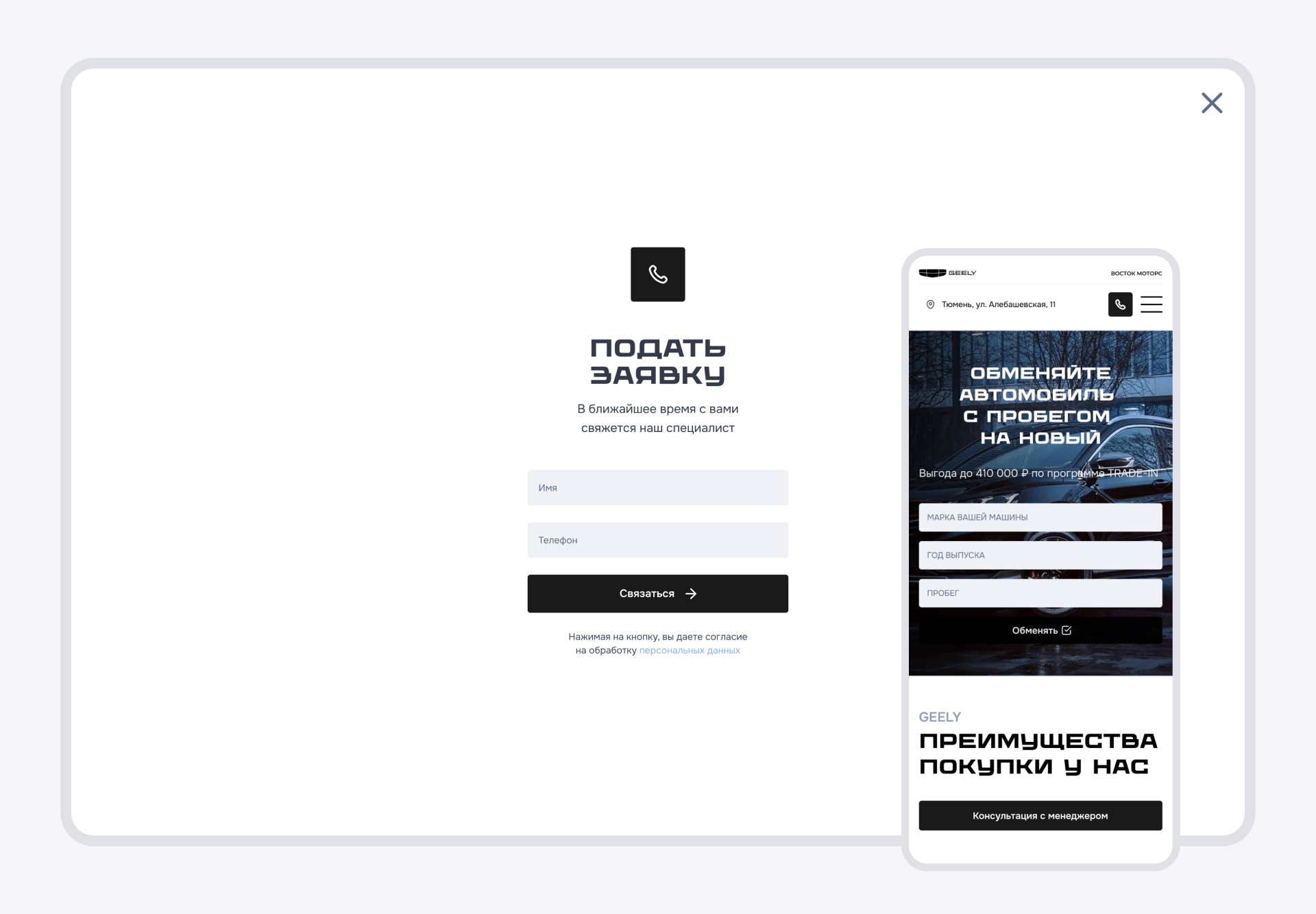 Форма trade-in собирает данные автомобиля клиента: марка, год выпуска и пробег. Эта информация автоматически передается в .CRM, что позволяет менеджерам сразу подготовить персональное предложение.