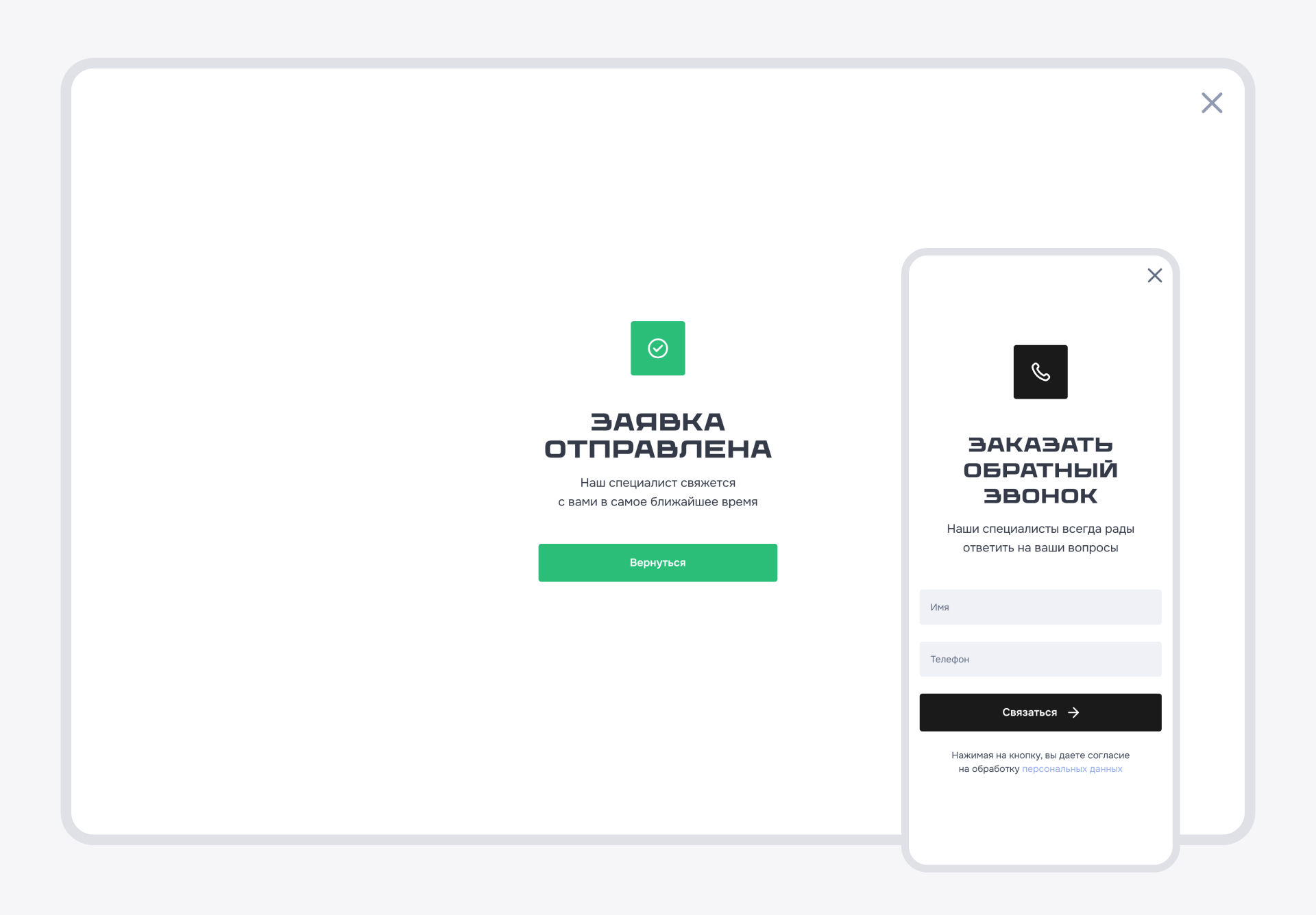 Стандартная форма для сбора заявок. Данные автоматически передаются в CRM-систему клиента благодаря интеграции с сайтом.