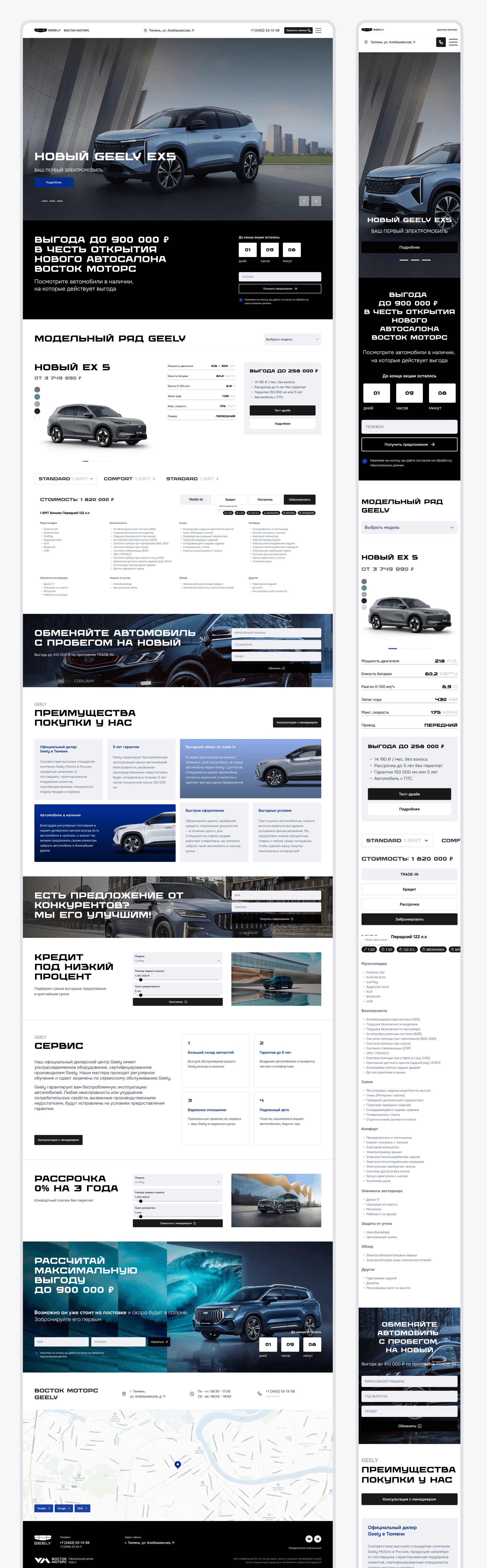 Целевая страница для автодилера Geely обеспечивает высокий поток лидов. Страница выполнена в фирменных цветах бренда, что повышает узнаваемость и доверие пользователя. На странице расположены разные варианты блоков call-to-action: от стандартных с формой, до блоков с таймером.