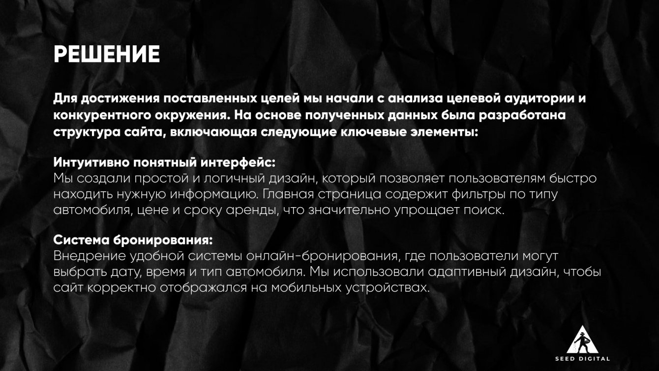 Основной задачей было создание платформы, которая бы обеспечивала удобный и интуитивно понятный интерфейс для пользователей, позволяя им легко бронировать автомобили как на короткий, так и на длительный срок.