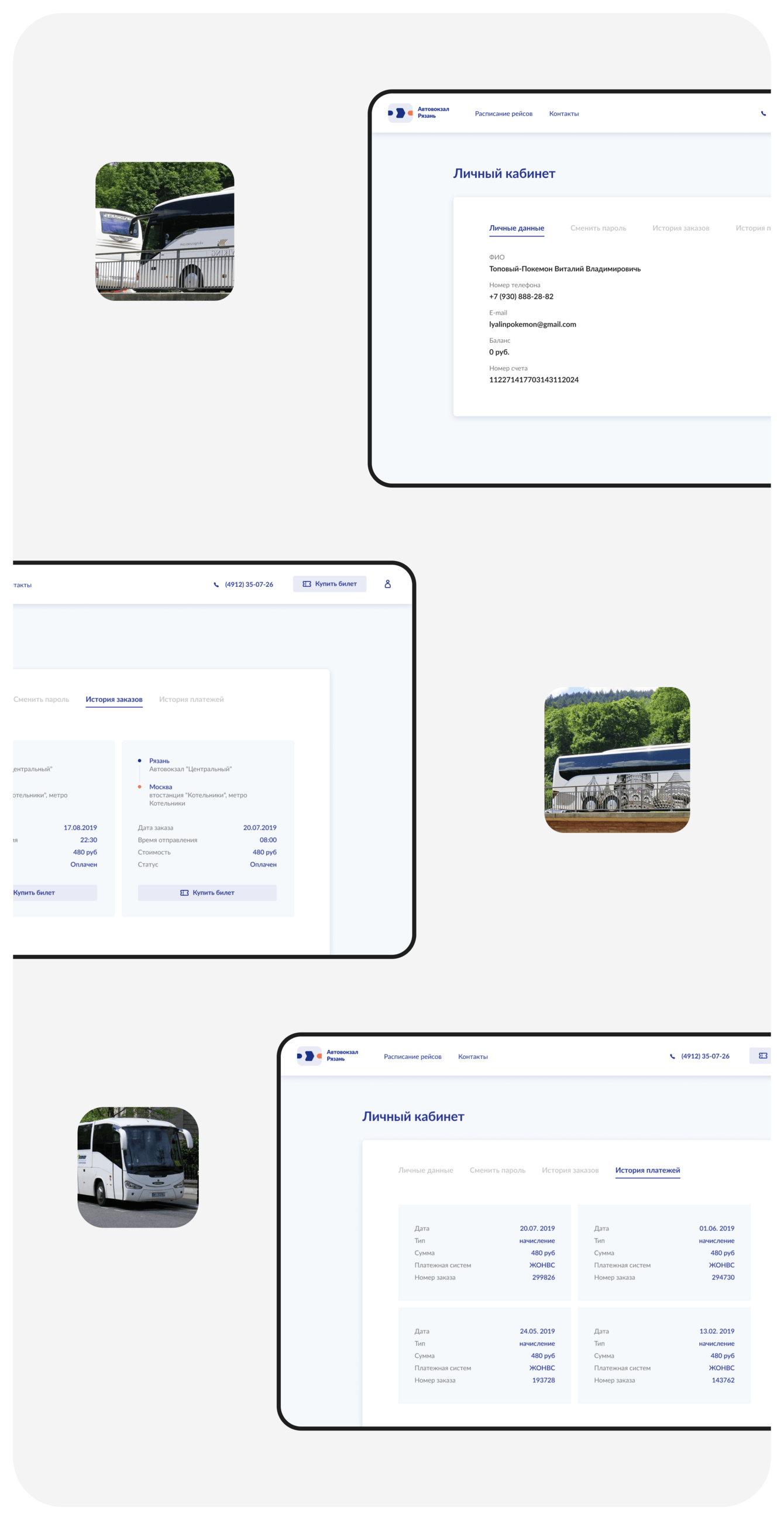 На сайте предусмотрен личный кабинет, в котором хранятся данные пользователя, есть возможность смены пароля, просмотра истории заказов и истории платежей.