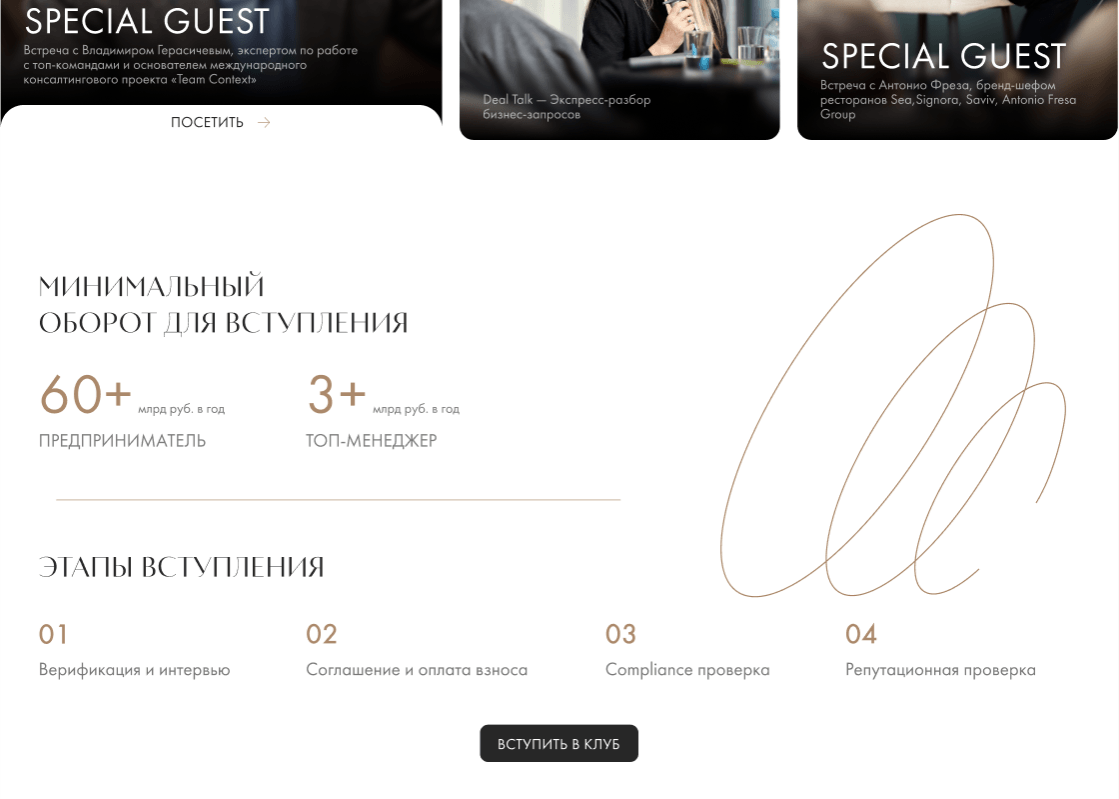 Перед нами стояла задача: создать сайт для бизнес-клуба, объединяющий более 1500 успешных предпринимателей. Вызов для нас заключался не просто в презентации клуба, а в разработке инструмента для ведения B2B-коммуникации, который:
