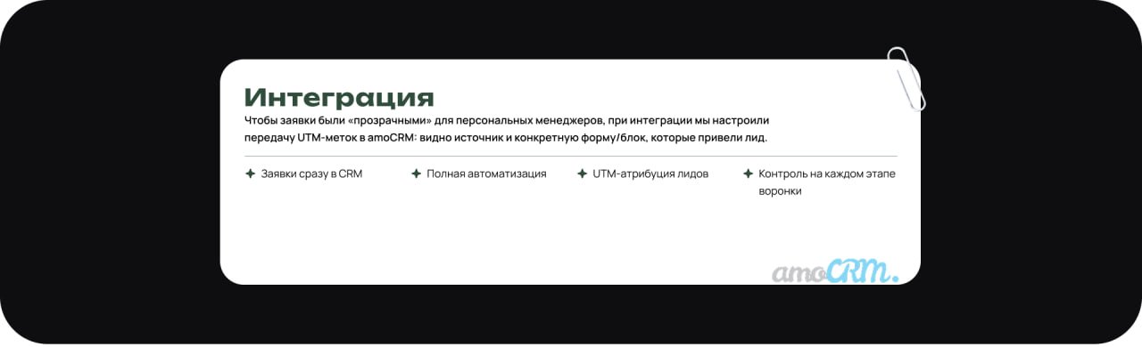 Интегрировали все формы сайта с amoCRM. Каждая заявка автоматически попадает в систему, снабженная UTM-метками. Это позволило закрыть вопрос с «потерянными» лидами и дало аналитику по эффективности контента.