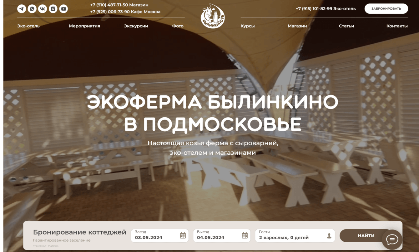 Для удобства бронирования услуг экофермы стоит подключить сайт к платформе TravelLine. Это позволит клиентам легко и быстро бронировать номера в домиках и коттеджах.
