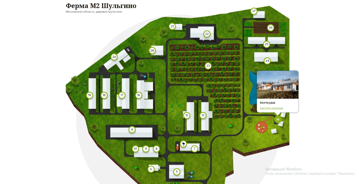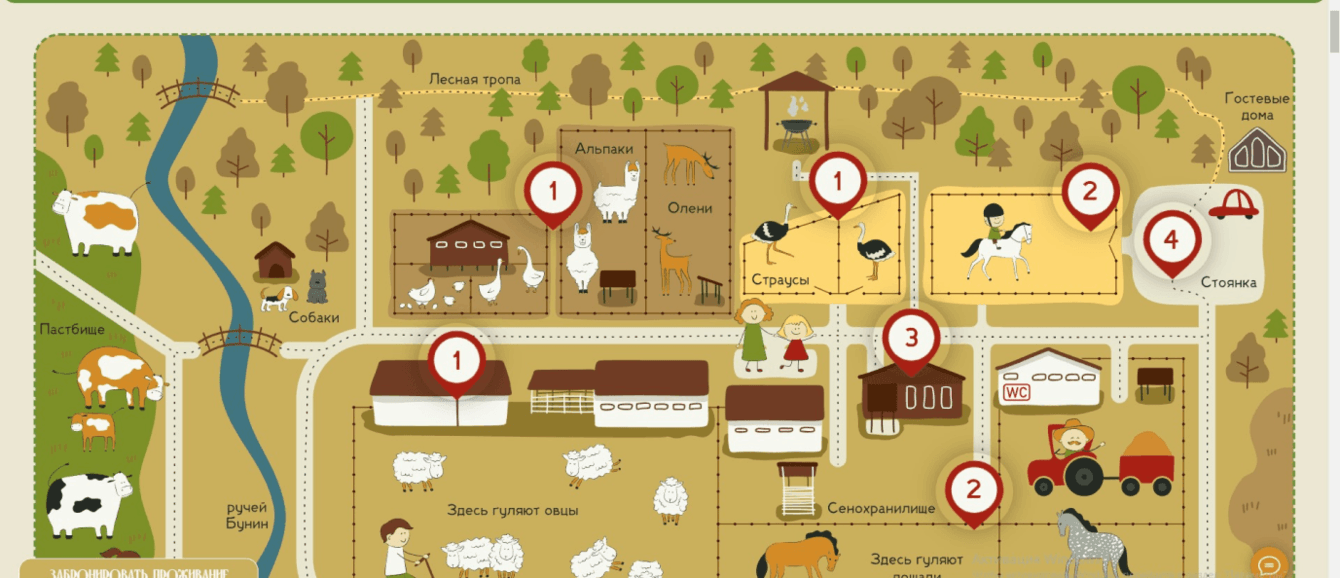 На карте стало удобно различать объекты: летние домики и коттеджи, сыроварню, классы для образовательных мероприятий, птичник, крольчатник и другие строения фермы.