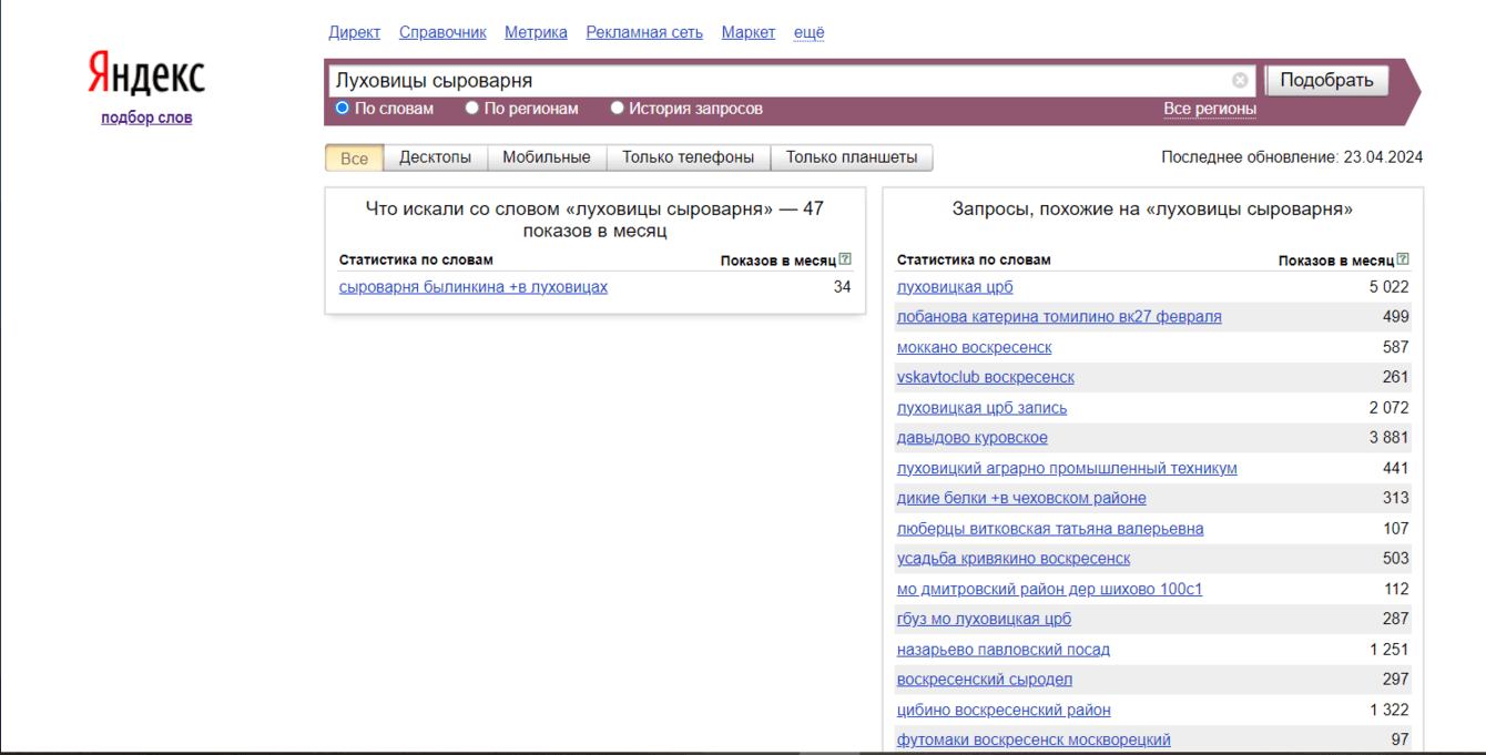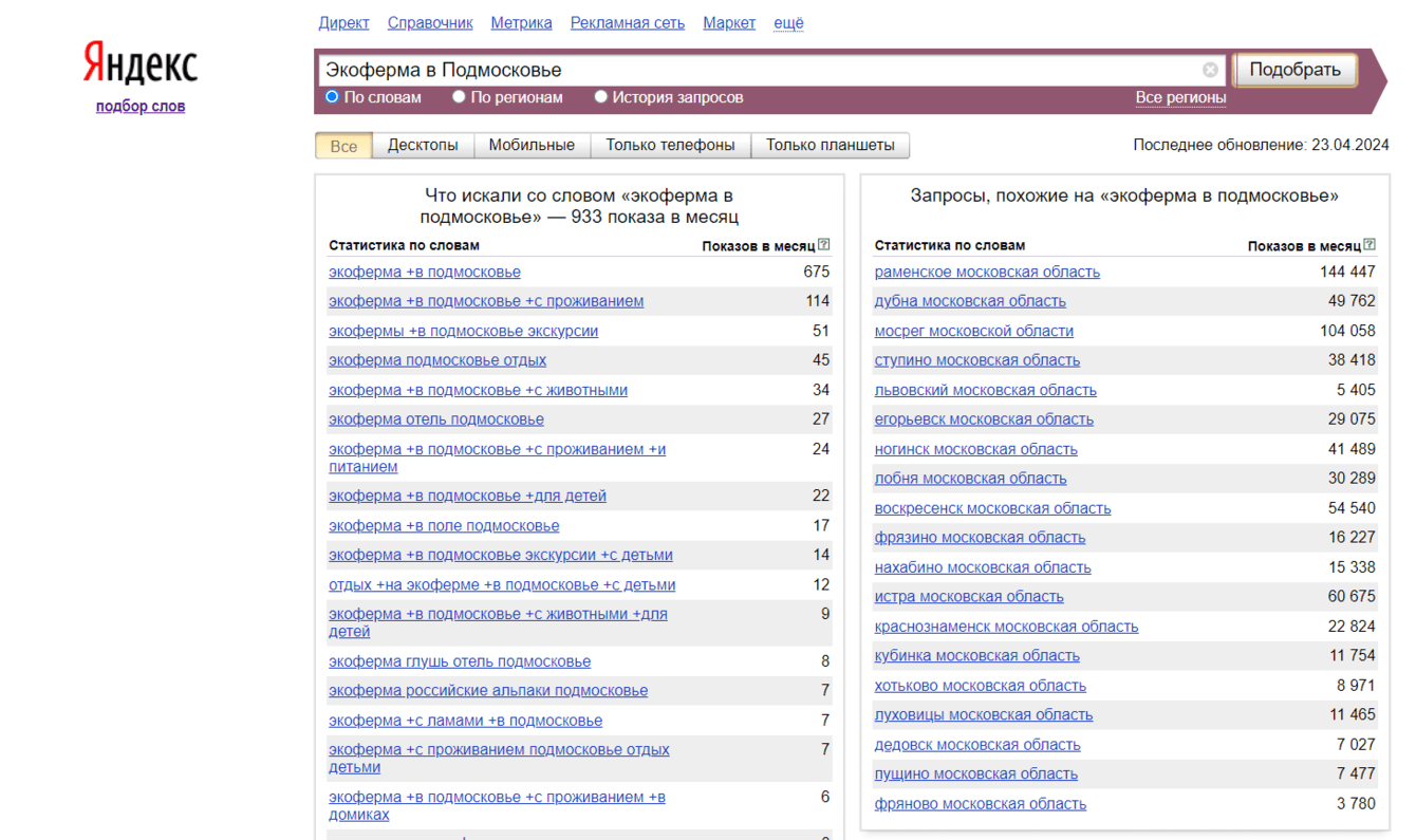 В текст на сайте мы интегрировали следующие ключи: «с животными», «с проживанием», «для детей», «отдых», «отдых на ферме», «эко отель», «экскурсия на козьей ферме», «экскурсия на сыроварню», «дегустация» и т.д.
