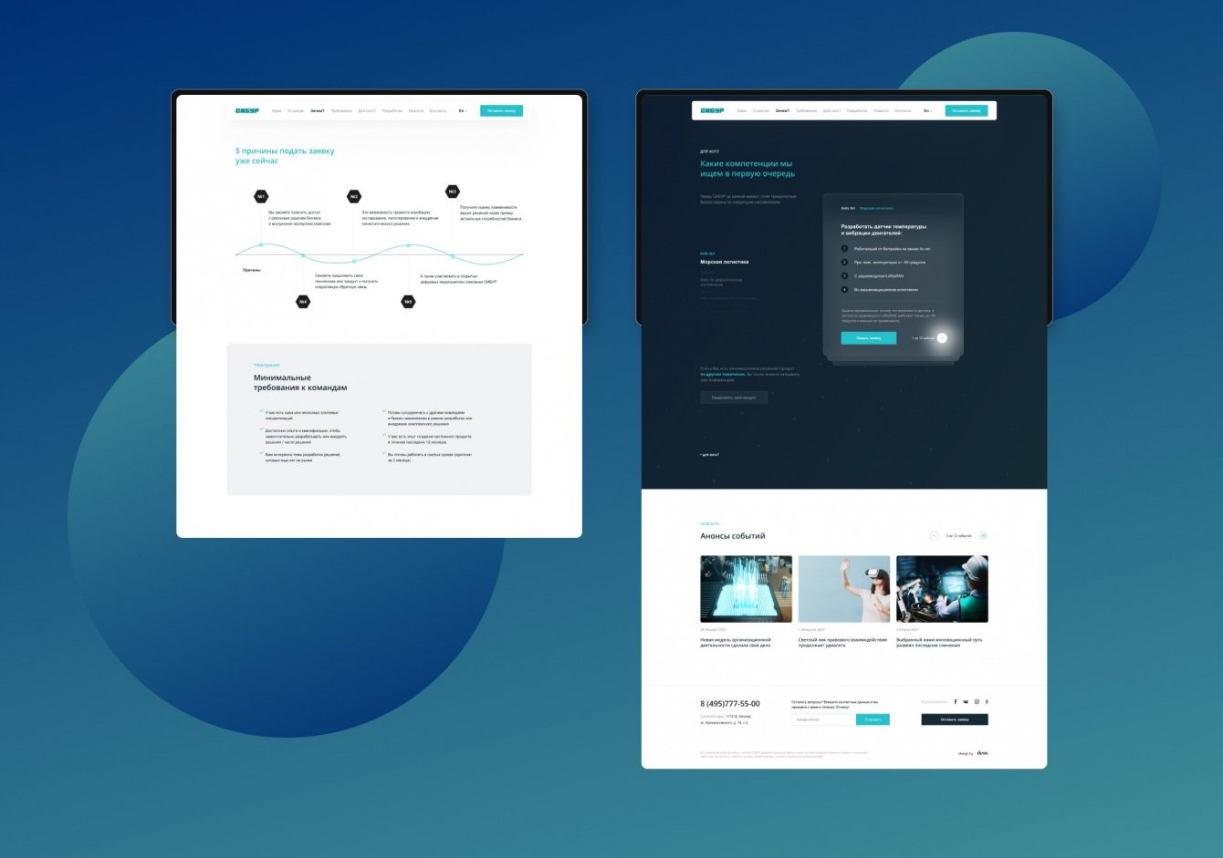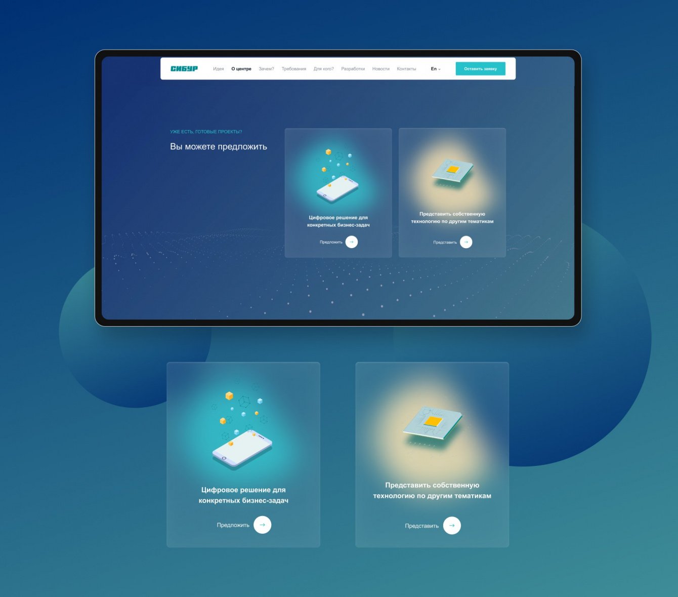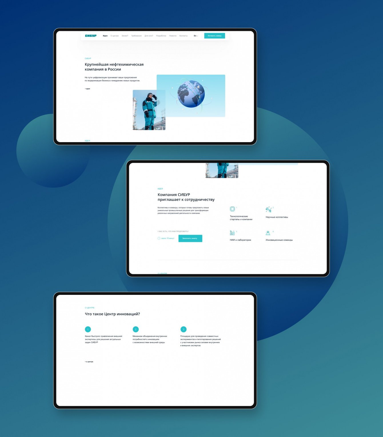 ПАО “СИБУР ХОЛДИНГ” – нефтехимическая компания, имеющая несколько подразделений. Одно из них – центр инноваций, где компании могут предложить свои разработки и технологические решения. Нам поставили задачу сделать одностраничный сайт с информацией о центре, а также с возможностью подать заявку на проект. Важно было показать инновационность компании, поэтому мы выбрали лаконичный дизайн с ненавязчивой анимацией. Для компоновки информации использовались блоки с инфографикой.