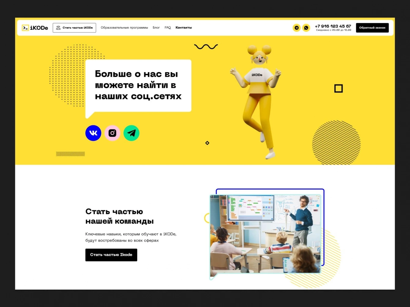 Создать жизнерадостный и яркий сайт, который поможет привлечь новых клиентов. Закрыть боли, но при этом не перегружать страницы информацией. Показать, что iKODe — это не курсы для расширения общего кругозора, а качественная подготовка к будущей профессии.