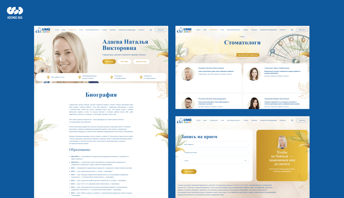 На страницах ресурса можно познакомиться с каждым специалистом, работающим в UMGkids. После первичной записи маленький пациент получает видеоприветствие от врача. Ребенку гораздо спокойнее идти на прием, если он уже знает доктора в лицо. Также на сайте есть полезный контент и инструкция для родителей, чтобы первый визит прошел максимально комфортно.