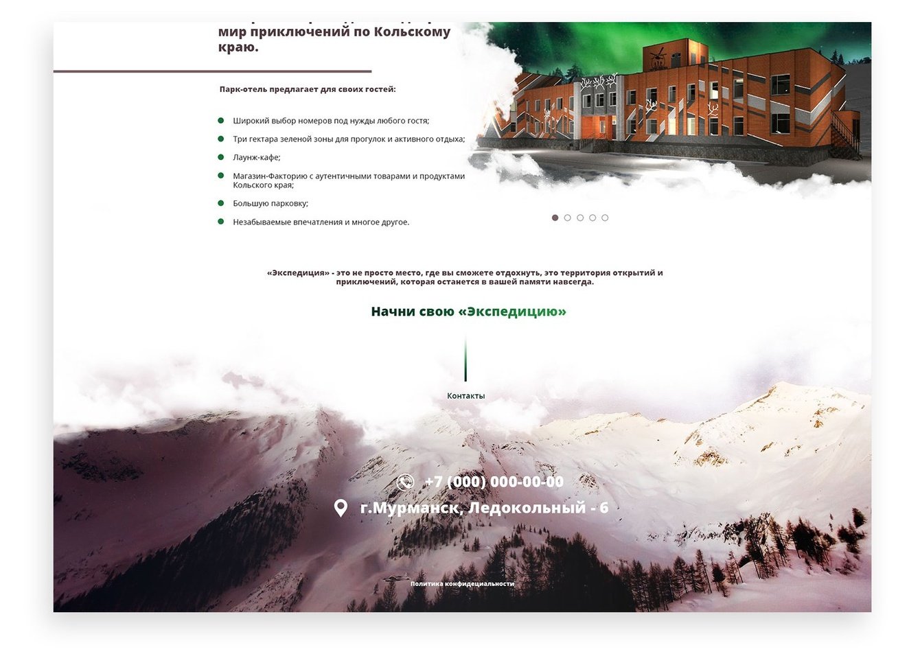 Разработать сайт-заглушку по реорганизации действующего отеля "Тамара" в городе Мурманск в отель класса 3 звезды — "Экспедиция".