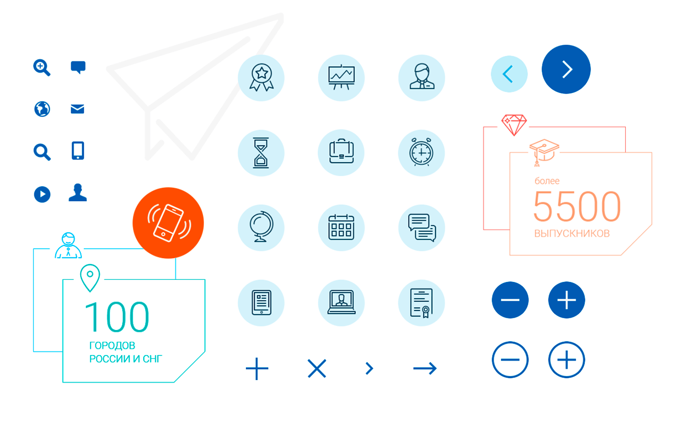 Было решено использовать фирменную синюю цветовую гамму ТУСУРа. А чтобы сайт не выглядел слишком сдержанно и сухо, мы использовали светло-зелёный цвет для некоторых графических элементов. Кроме того, мы нарисовали подходящие по стилю иконки, тем самым добавив эмоции в дизайн.