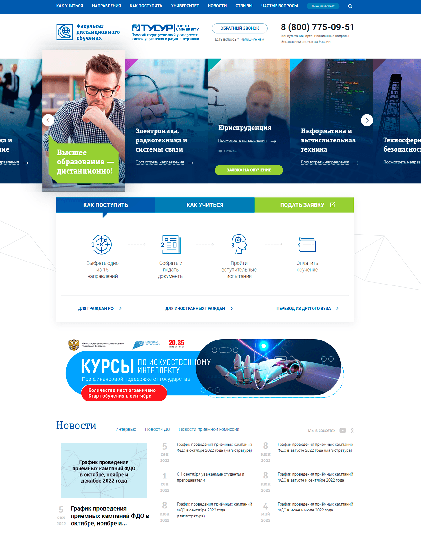 Разработать сайт для факультета дистанционного образования (ФДО) ТУСУР с целью привлечения потенциальных клиентов через повышение качества информации (дизайн, структурированные данные, удобная подача информации), а также увеличение конверсии посетителей, опираясь на фирменный стиль университета и сохраняя узнаваемость и принадлежность к ТУСУР.