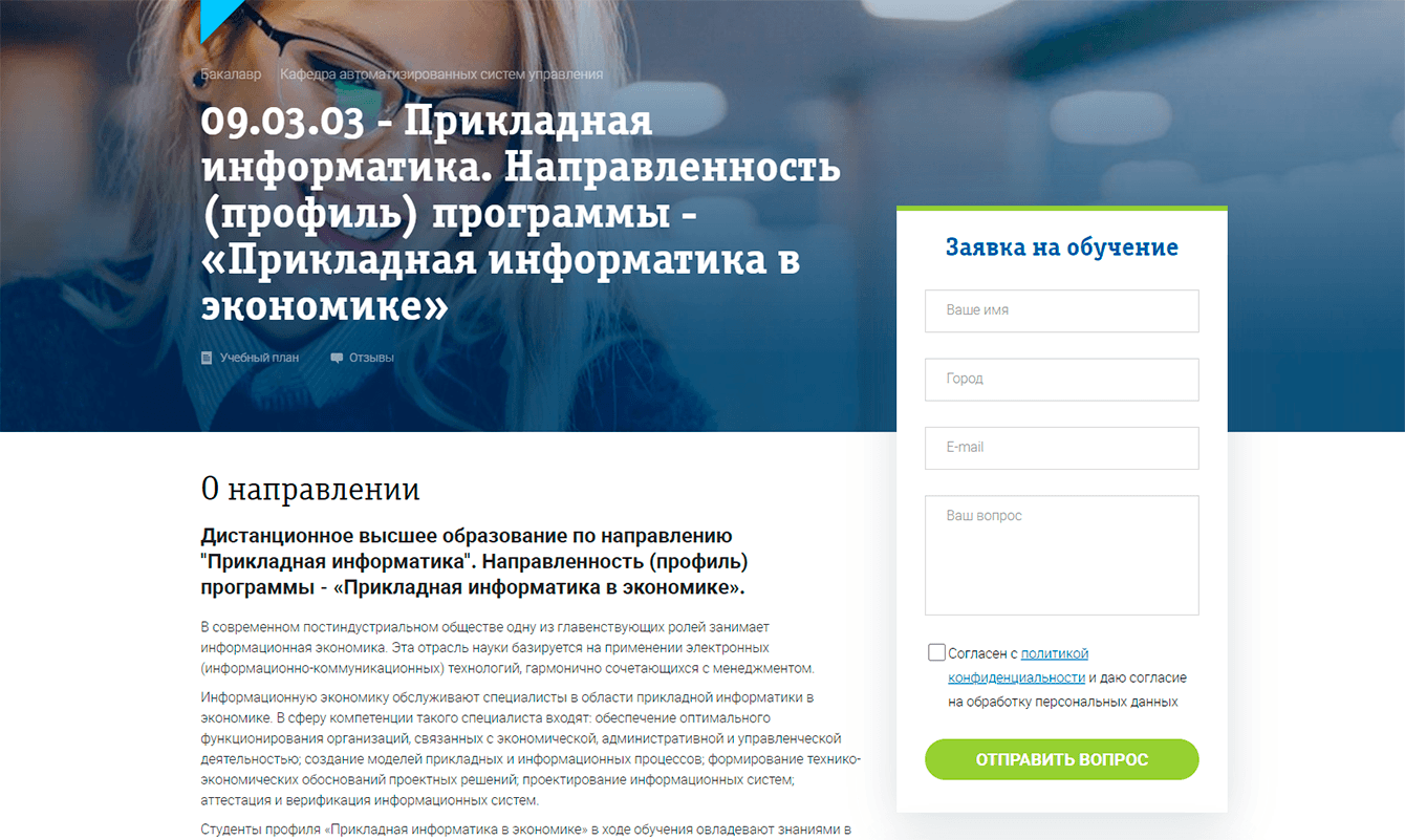 Данная страница включает в себя краткое описание общего направления со списком всех поднаправлений (в виде карточек), входящих в его состав. Здесь можно узнать о перспективах, изучить документ, который будет выдан по завершении обучения, прочесть отзывы выпускников и оставить заявку.