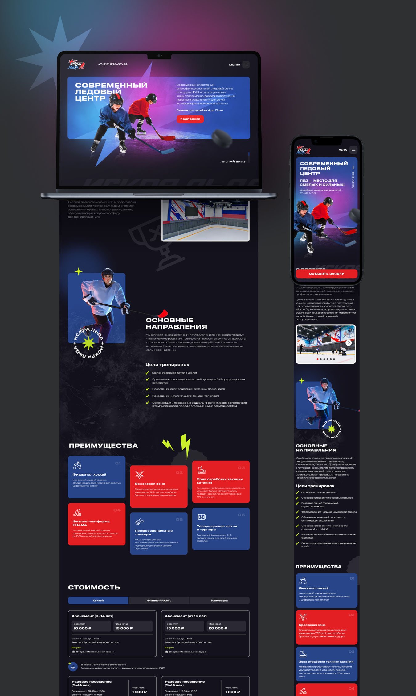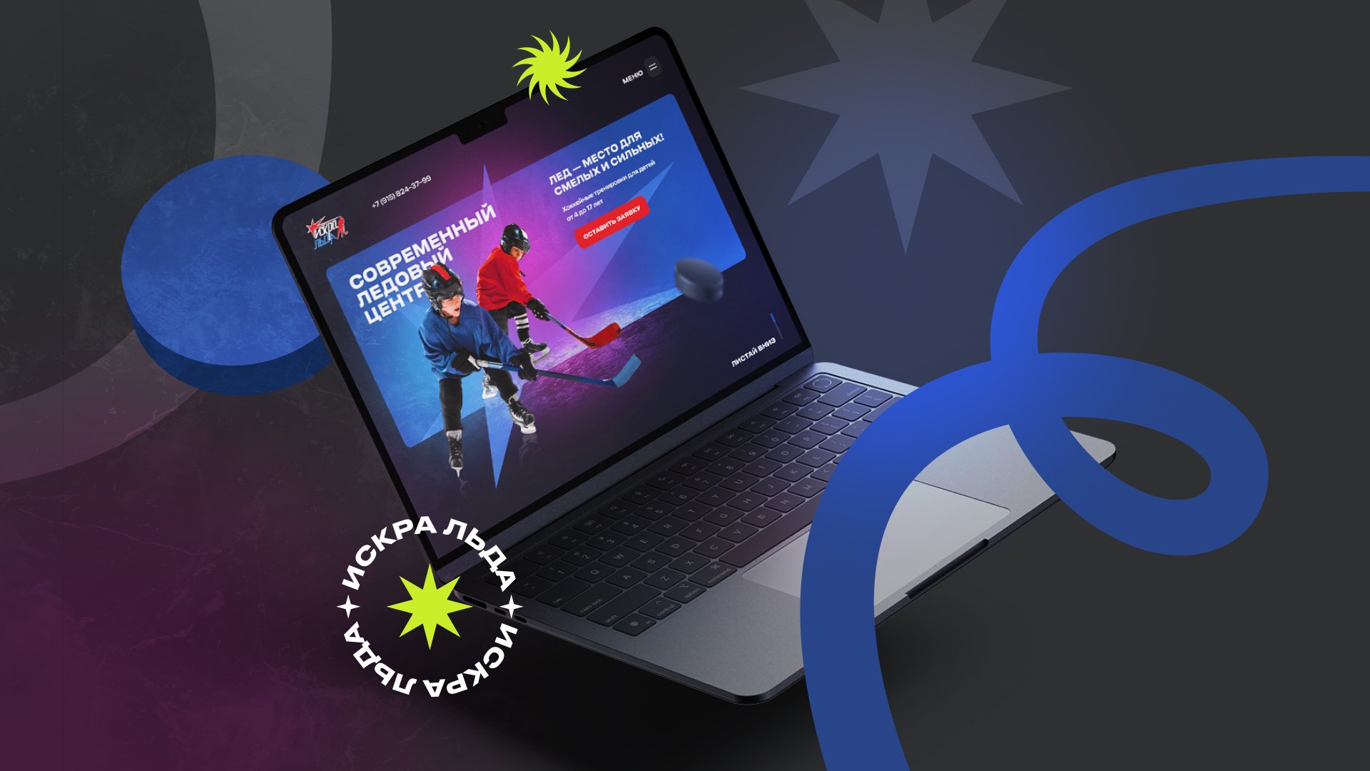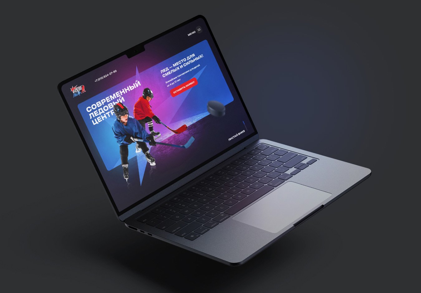 Первый экран сделали интерактивным – разместили выезжающих детей-хоккеистов, чтобы акцентировать внимание на главной тематике проекта и динамике спорта. Разместили базовую информацию и форму для отправки заявки.