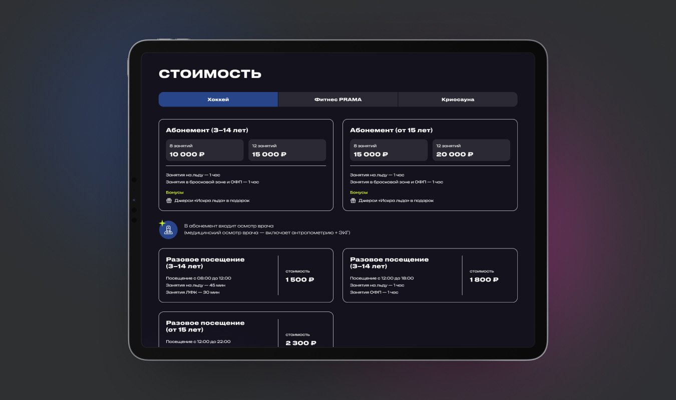 Клиент обратился к нам накануне открытия в Иванове центра фиджитал-хоккея — инновационного проекта. Требовалось разработать сайт, раскрывающий суть центра и услуг, в сжатые сроки.