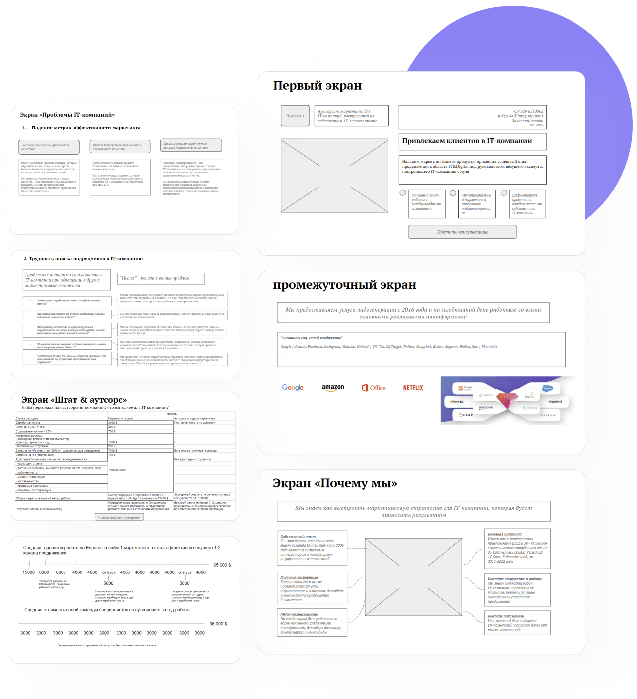 При разработке отдали предпочтение комбинации светлых и сдержанных цветов, таких как белый, серый, темно-синий и акцентный фиолетовый, чтобы создать чистый и профессиональный вид.