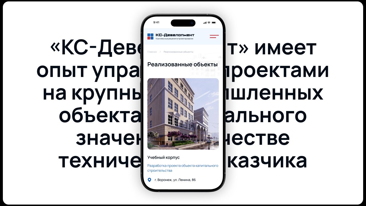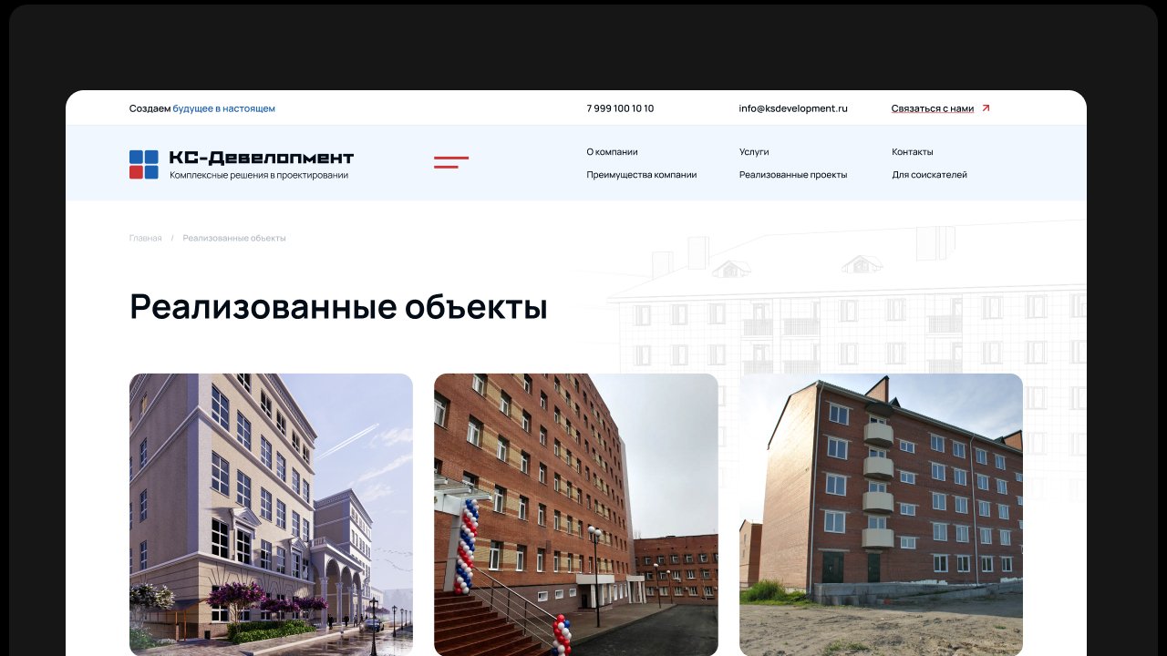 - Раздел с реализованными проектами – для демонстрации профессионализма и опыта команды КС-Девелопмент.