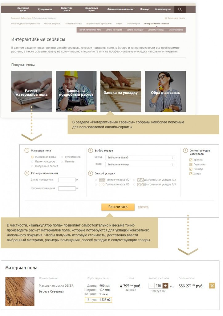 На сайте реализовано несколько онлайн-сервисов, особенной популярностью среди пользуется «Калькулятор пола». С помощью сервиса можно самостоятельно рассчитать количество материалов, потребующихся для укладки того или иного напольного покрытия