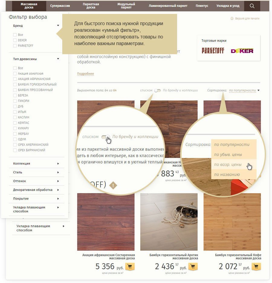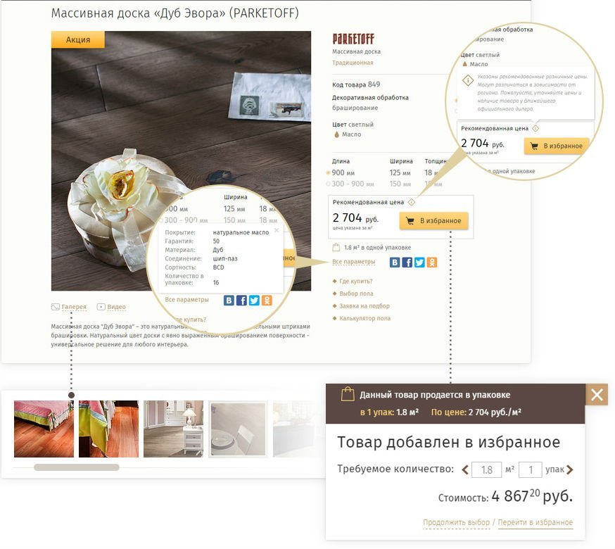 Фильтрация по оттенкам, коллекциям, типам древесины, брендам и многим другим критериям позволит потребителю выбирать товар подходящий именно ему. В карточке товара так же видны все критерии фильтрации (размеры, цвет, покрытие), описание, детальные и интерьерные фотографии, рекомендованные розничные цены, а также похожие и сопутствующие товары. Пользователь может добавить любой товар в «Избранное» и в удобное время товар в ближайшем магазине.